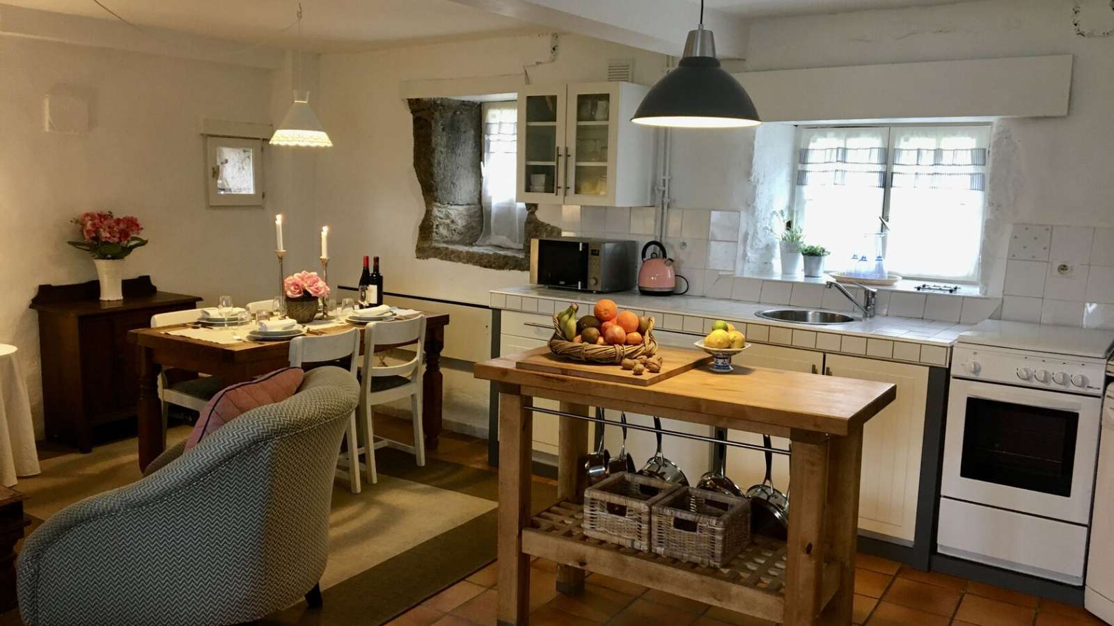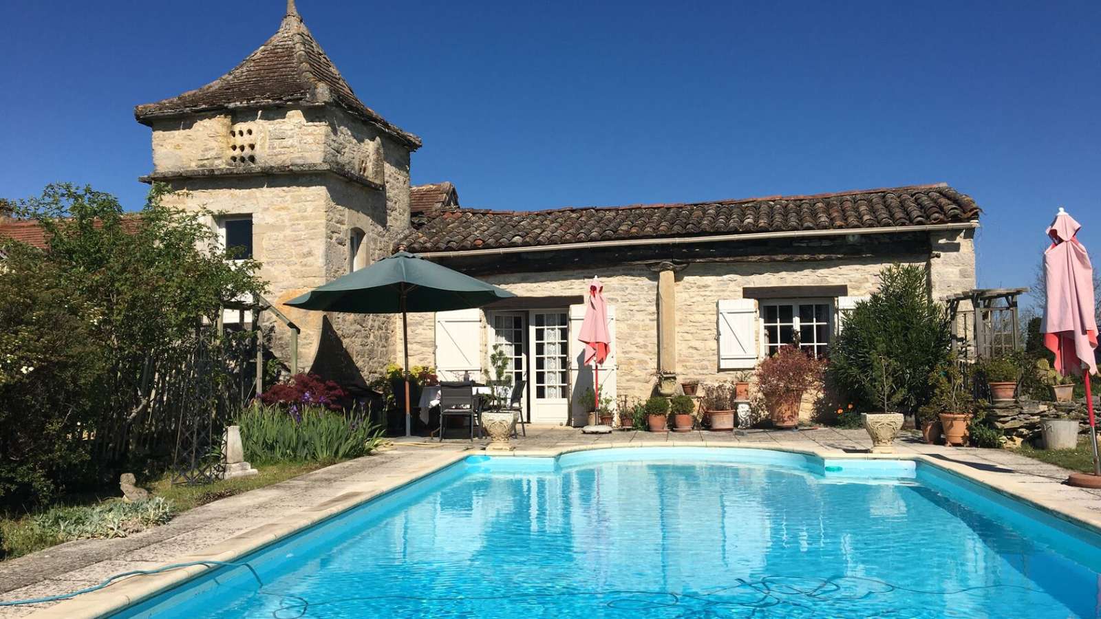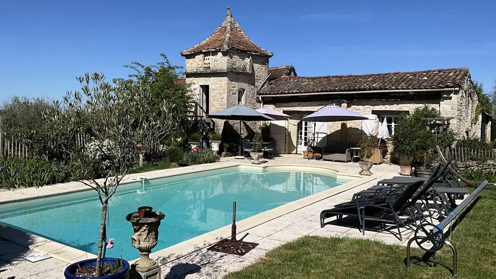 Une ferme en pierre merveilleusement restaurée avec une belle piscine entourée de 2 hectares de magnifiques jardins offrant une vue incroyable sur la campagne environnante. La propriété se compose de deux chambres d'hôtes dans la maison principale et d'un grand gîte indépendant pouvant accueillir 8 personnes. Le gîte peut être loué pour 2 à 4 à 8 personnes et le prix est ajusté en conséquence. Séjour minimum en haute saison est de 7 nuits (4 à 8 personnes). 3nuits minimum en basse et moyenne saison. Chiens bienvenus. Pérard se trouve à proximité des pittoresques villages médiévaux de Caylus et de Saint Antonin Noble Val, de Villefranche-de-Rouergue et à proximité des régions viticoles de Cahors et de Gaillac. Son emplacement allie les avantages d’une communauté locale à un réel sentiment de tranquillité rurale. Salon. Cuisine entièrement équipée avec cuisinière à induction, réfrigérateur, lave-linge, lave-vaisselle, cafetière, grille-pain, four micro-ondes, télévision et lecteur DVD. Table et fer à repasser Draps et serviettes fournis sauf les serviettes de piscine. Wifi gratuit.4 chambres: 2 avec grande lits et 2 avec 2 lits simples. 2 salles de bain. Jardin privé avec meubles de jardin et barbecue.