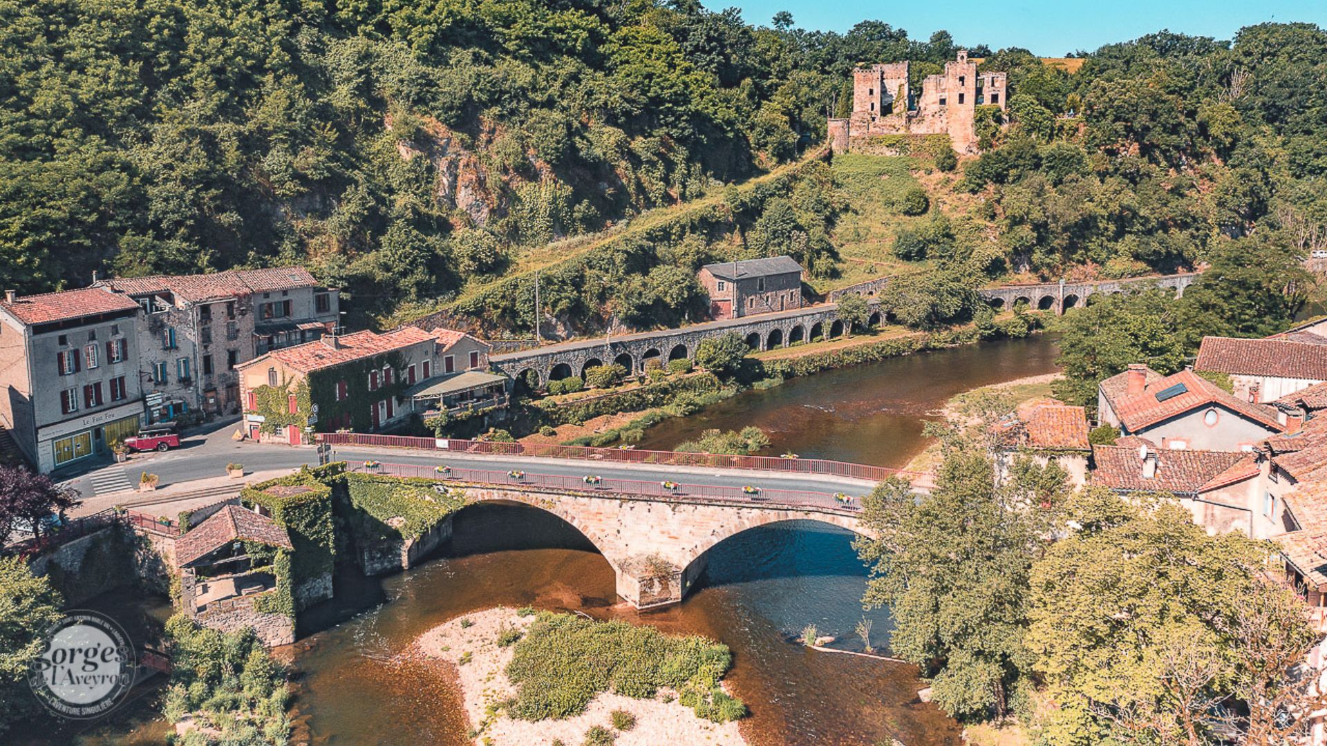 Les vallées étroites des deux rivières qui mêlent ici leurs eaux ont formé de profonds sillons aux versants recouverts d’une végétation dense, où dominent les chênes, mais surtout les châtaigniers qui donnent le fruit emblème de la commune (la châtaigne a même, à l’automne, son propre marché à Laguépie). Si de l’ancien complexe minier, qui fournissait autrefois le cuivre à l’artisanat auvergnat, ne subsistent que des éboulis, l’imposante ruine du château, elle, demeure, montant la garde sur le village.