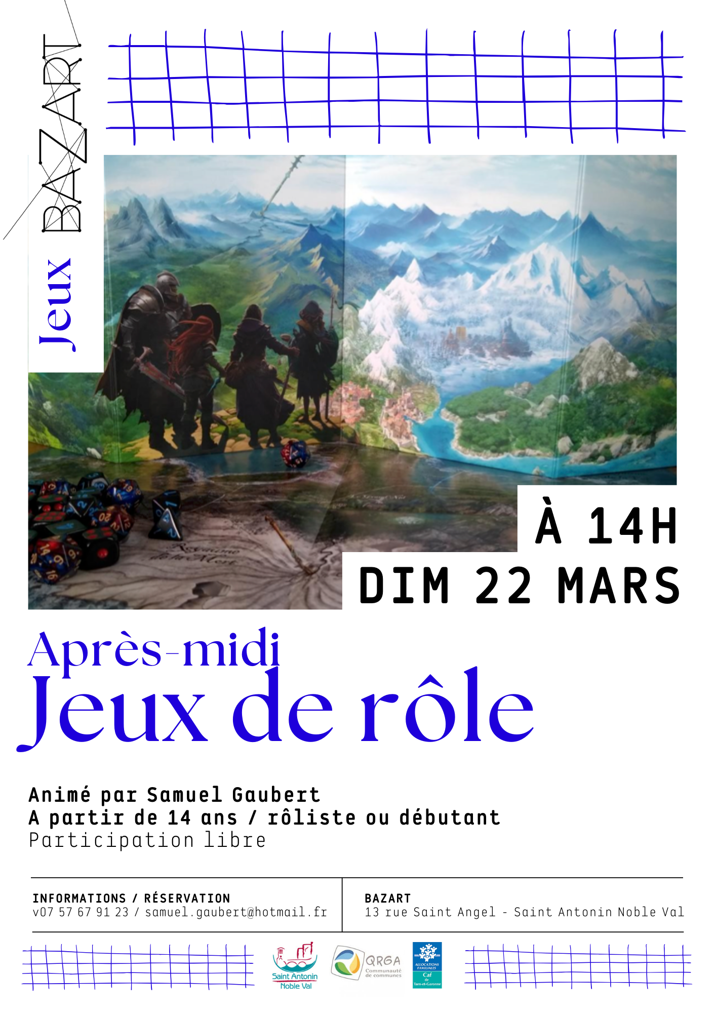 Venez jouer dans un univers de médiéval fantasy original (mais pas trop), imaginé par Samuel Gaubert, joueur de jeux de société, venu au jeu de rôle par l'intermédiaire de "let's play" comme "Game of Roles", "la Bonne Auberge" ... Matériel fourni. Venez jouer dans un univers de médiéval fantasy original (mais pas trop), imaginé par Samuel Gaubert, joueur de jeux de société, en famille ou entre amis, venu au jeu de rôle par l'intermédiaire de "let's play" sur Twitch et Youtube comme "Game of Roles", "la Bonne Auberge" ou "Table Quest". Séduit par la formule JDR, il a voulu créer un univers afin de faire jouer ses proches et souhaite maintenant partager ce loisir captivant dans le cadre du Bazart.