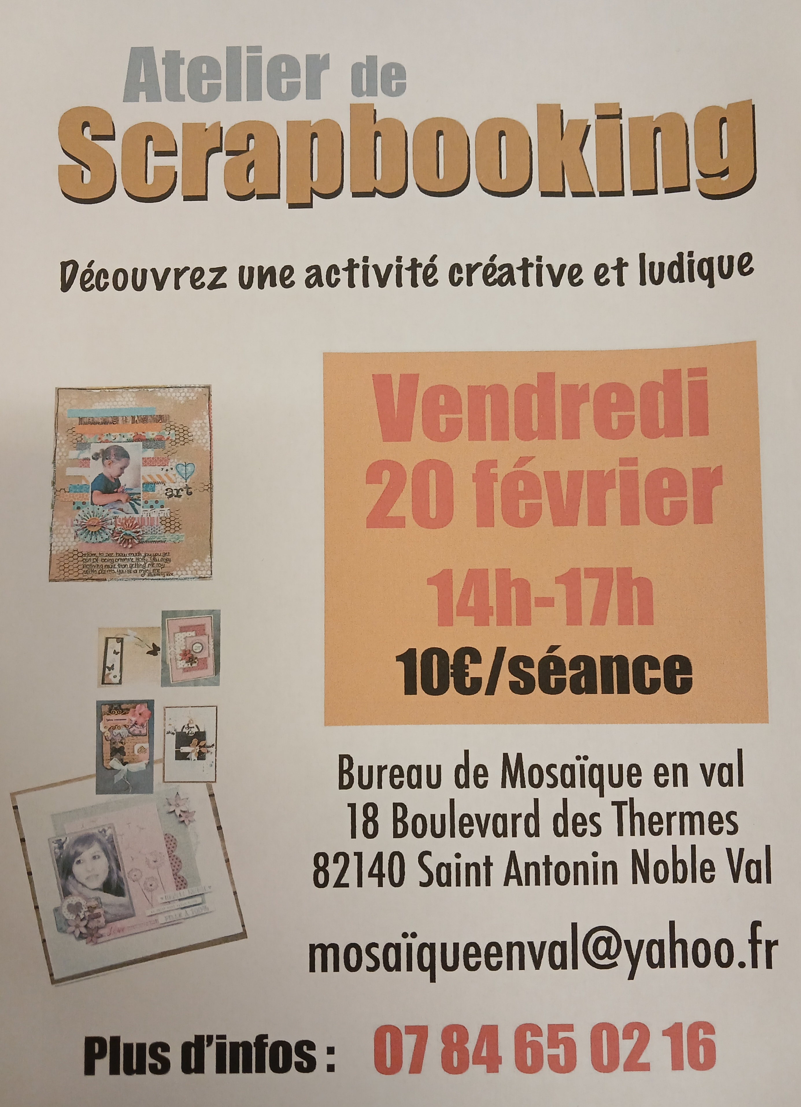 Atelier de scrapbooking sur Saint-Antonin-Noble-Val ! Découvrez une activité créative et ludique 20 février de 14h à 17h 10 euros la séance Plus d'infos : 07 84 65 02 16