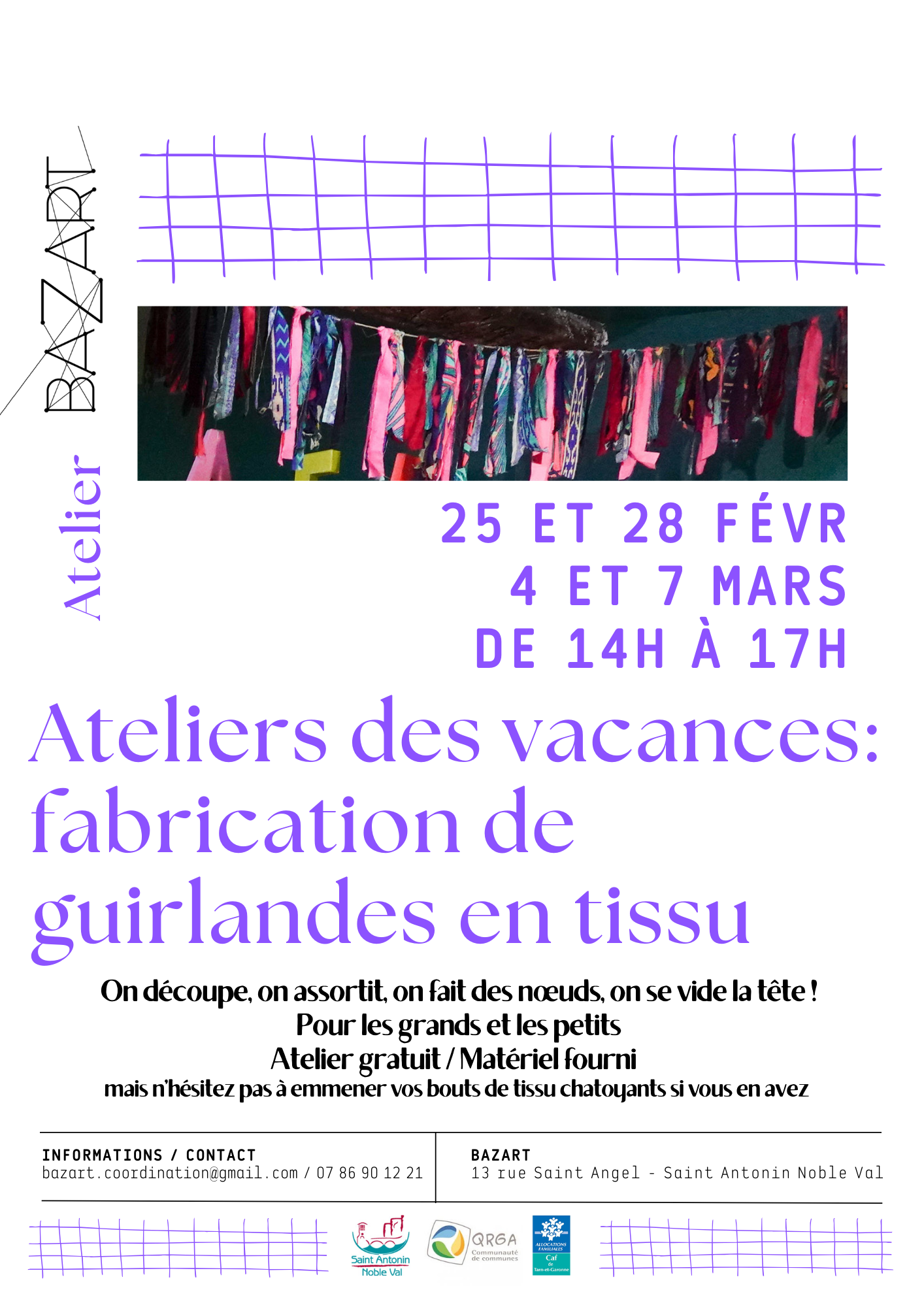 Atelier gratuit / Matériel fourni, mais n’hésitez pas à emmener vos bouts de tissu chatoyants si vous en avez