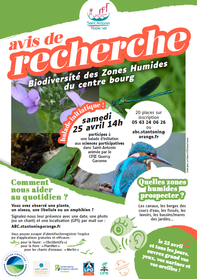 Participez à une balade d'initiation aux sciences participatives dans Saint-Antonin, animée par le CPIE Quercy Garonne, pour découvrir la biodiversité des zones humides du centre bourg. Cette balade initiatique vous invite à explorer la biodiversité des zones humides du centre bourg de Saint-Antonin. Apprenez à identifier les espèces et à contribuer aux sciences participatives. Les zones humides à prospecter incluent les canaux, les berges des cours d'eau, les fossés, les lavoirs, les bassins et les mares des jardins. Une occasion unique d'ouvrir grand vos yeux, vos narines et vos oreilles pour observer la nature.