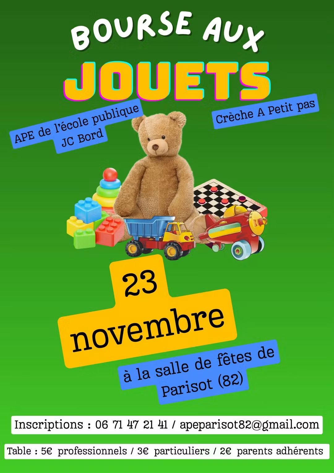 Venez chiner de jolis jouets, jeux et surprises dans une ambiance conviviale. C'est bientôt Noël ! Gourmandises sur place. Participants : Table : 5 € pro / 3 € particuliers / 2 € parents adhérents Inscriptions : 06 71 47 21 41 ou apeparisot82@gmail.com Organisé par l'APE et la Crèche de Parisot82