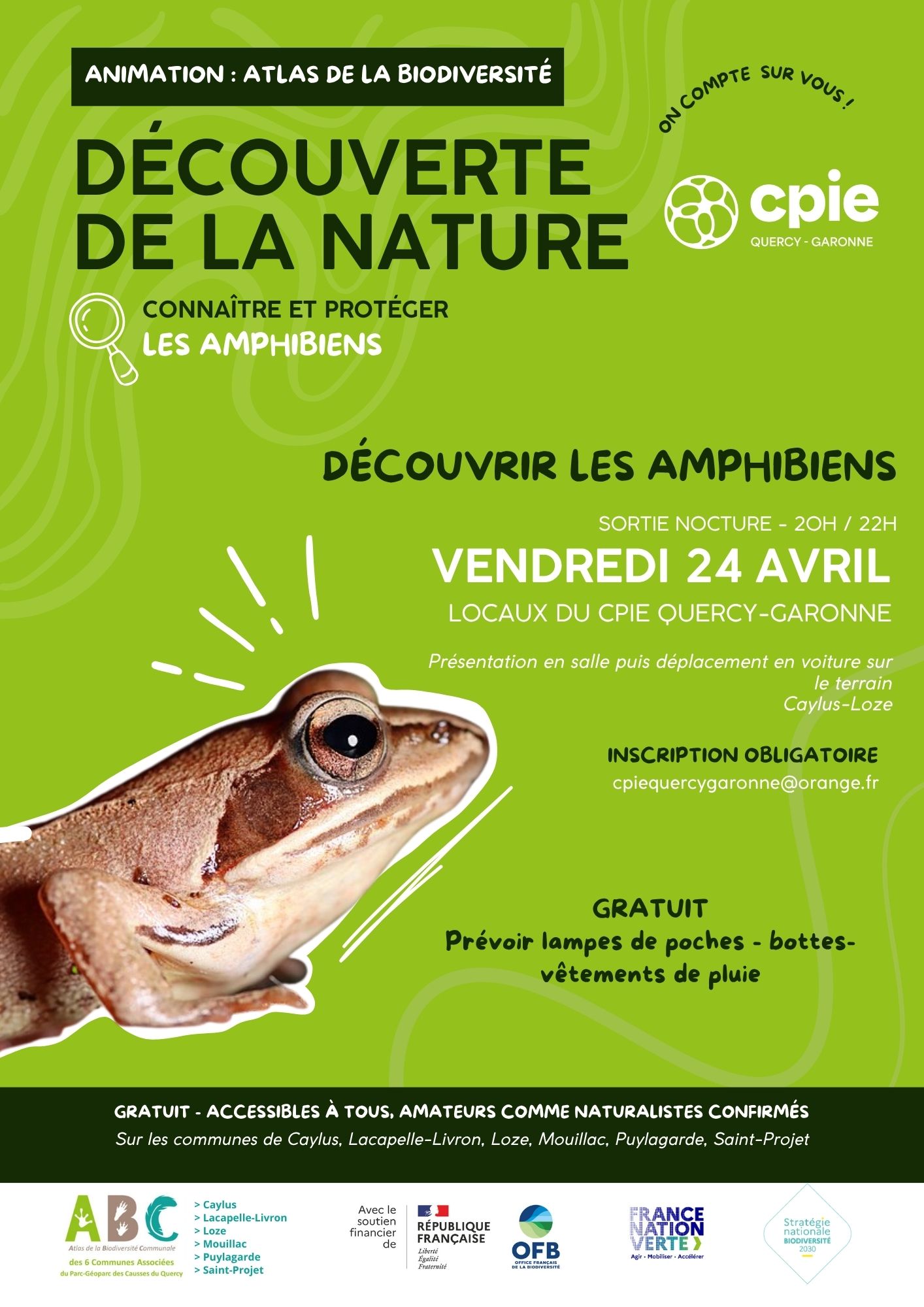 Découvrez les amphibiens lors d'une sortie nocturne. Présentation en salle suivie d'un déplacement sur le terrain à Caylus-Loze. Inscription obligatoire. Participez à une animation sur la Biodiversité pour connaître et protéger les amphibiens. Cette sortie nocturne, accessible à tous, amateurs comme naturalistes confirmés, débutera par une présentation en salle avant un déplacement en voiture sur le terrain à Caylus-Loze. N'oubliez pas d'apporter lampes de poches, bottes et vêtements de pluie. L'événement est gratuit et se déroule sur les communes de Caylus, Lacapelle-Livron, Loze, Mouillac, Puylagarde et Saint-Projet.