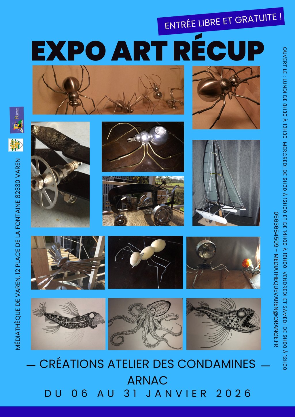 Venez découvrir les créations de l'Atelier des Condamines, entrée libre et gratuite. LIEU 12 Pl. de la Fontaine, 82330 Varen DATES Du mar. 6 janv. au sam. 31 janv. HORAIRES Ouvert le lundi de 8h30 à 12h30, Mercredi de 9h30 à 12h/14h à 18h, Vendredi et Samedi de 9h à 12h30 2026, en route pour de nouvelles expositions à la médiathèque de Varen.