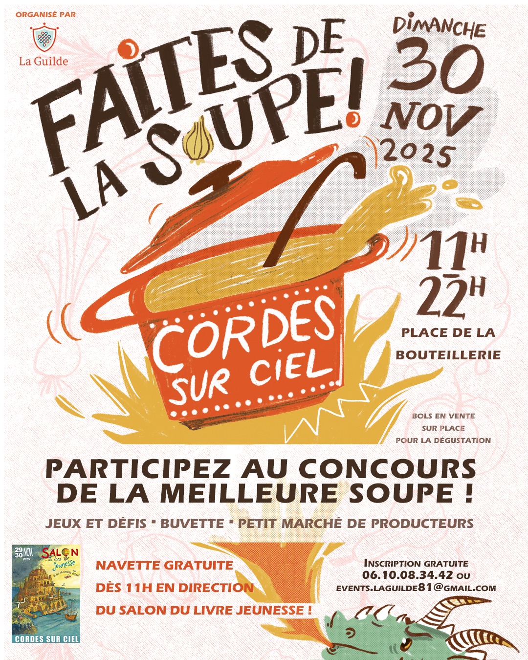 Faites de la soupe à Cordes sur Ciel ! Dim. 30 nov. dès 11h, place de la Bouteillerie : concours, dégustations, marché de producteurs, jeux et buvette. Navette gratuite vers le Salon du Livre Jeunesse. Faites de la soupe ! revient à Cordes sur Ciel le dimanche 30 novembre dès 11h, place de la Bouteillerie !
