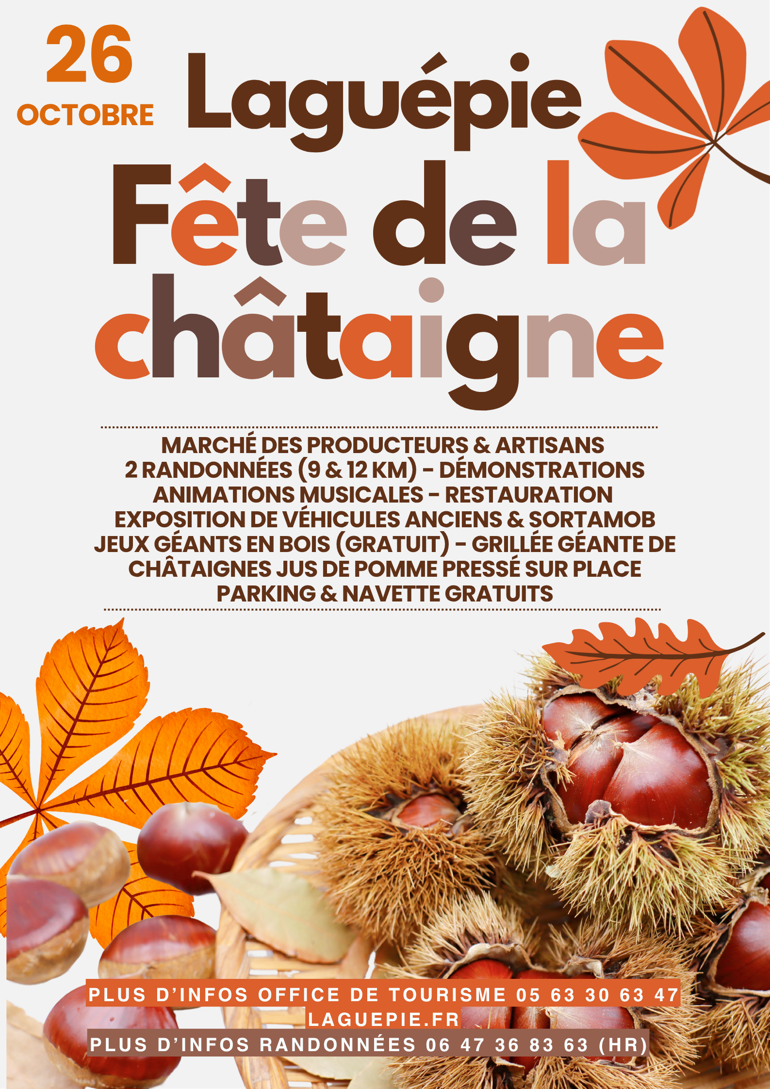 Fête de la Châtaigne et de l'artisanat La traditionnelle foire à la châtaigne du dernier dimanche d’octobre aura lieu le 26 octobre 2025 ! L’automne est là et annonce avec lui sa plus belle manifestation à Laguépie : La foire à la Châtaigne. Depuis 2001, notre charmant petit village se pare de ses plus beaux atouts pour cette programmation festive, gastronomique et pédagogique. Tout au long de la journée, venez randonner, découvrir, déguster, vous amuser, ou tout simplement vous balader à Laguépie. Grillée géante de châtaigne (2 tonnes), Jus de pommes pressées sur place (2,8 tonnes), Crêpes à base de farine de châtaigne (100L), Vente de produits dérivés (Confiture, farine, madeleine…) au stand de l'association organisatrice "De bogues en châtaignes", Buvette de l'asso avec bières locales NOUVEAUTÉ 2024: 100 cubis de 3L de jus de pommes pasteurisé et Bière à la châtaigne !! 3 randonnées (7, 12 et 14 kms) (Inscription payante 6€/ personne - à partir de 8h sur place - départ maxi 10h), Inscription préalable possible par téléphone aux heures de repas au 06 47 36 83 63 Nombreux exposants et leurs savoir-faire local aussi raffiné que diversifié, Nombreuses expositions et démonstrations (greffes, variétés de pommiers, poiriers, châtaigniers, noyers…), Jeux géants en bois gratuits dans la rue du Gué L'atelier du Rétro Véhicule du Rouergue sera ouvert toute la journée Exposition de véhicules anciens sur les quais de l'Aveyron Le Château Lou Viel Castel ouvre ses portes pour l'occasion, de 11h à 18h Les commerces sont ouverts jusqu'à 12h30, les bars toute la journée / nombreuses possibilités de restauration sur place Tous les restaurateurs de Laguépie vous proposent un menu à base de châtaigne : - Repas préparé par Pascal Doucet à la salle des fêtes 23€ (sans boissons), repas à emporter où à manger sur place - Terrine de butternut châtaignes et magret de canard - Longe de porc farcie à la châtaigne et garniture de légumes - Bavarois à la châtaigne - Sur Réservation au 06 41 37 80 65 - A l’Angle : 25 couverts sur place pour un menu gastronomique, et menu à emporter Réservation souhaitée au 06 79 59 31 49 - A l’Oustal : Réservation souhaitée au 09 86 75 87 29 - Au camping Les Tilleuls : réservation souhaitée au 07 86 23 12 61 Il n'y a pas de doutes, c'est à Laguépie que ça se passe !