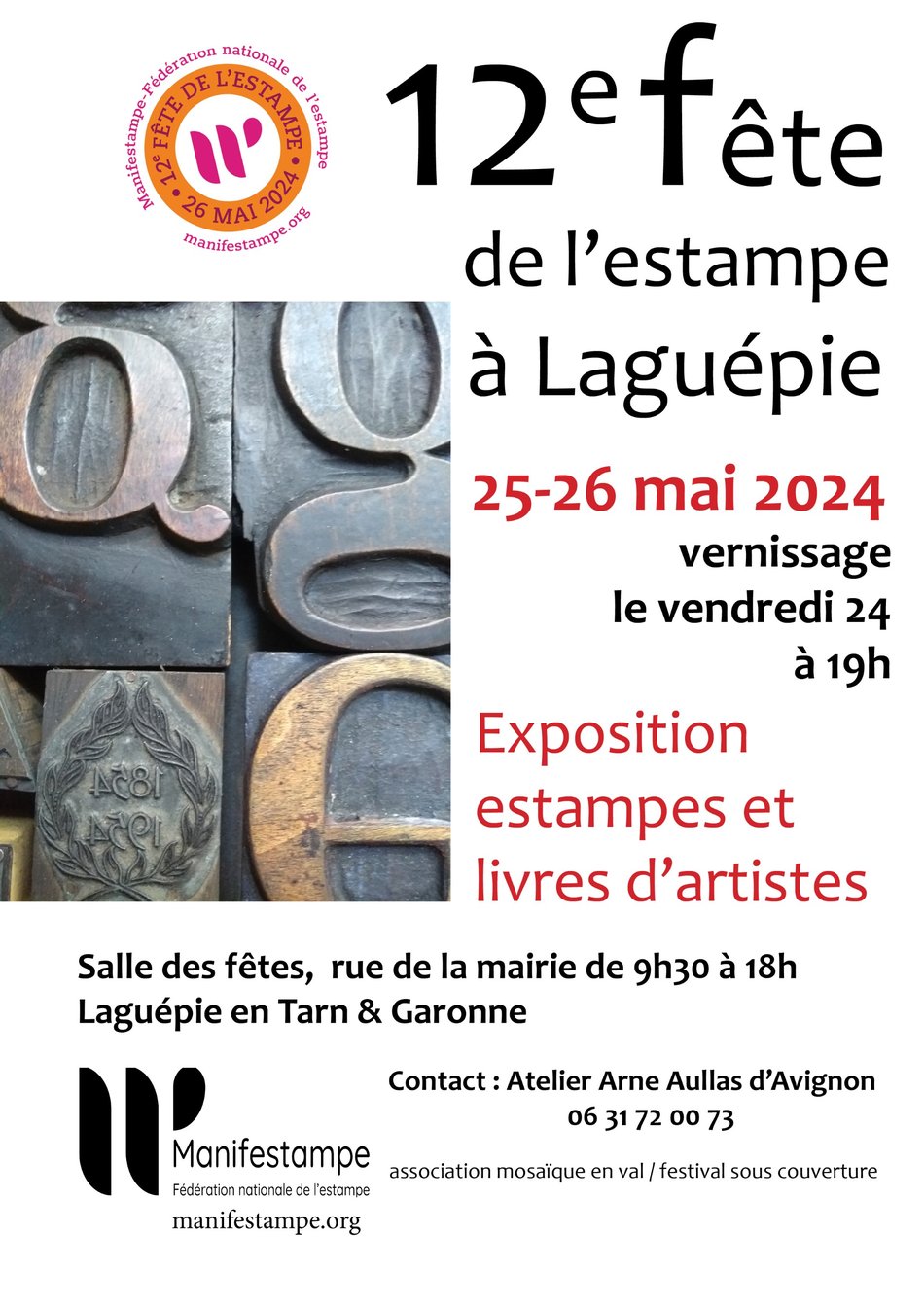 Rendez-vous à la Salle des fêtes de Laguépie pour la Fête de l'estampe ! LIEU : Salle des fêtes Laguépie DATES : Du sam. 23 mai au dim. 24 mai HORAIRES : de 9h30 à 18h TARIFS: entrée libre Exposition estampes et livres d'artistes, contact Arne Aullas d'Avignon 06 31 72 00 73 Association mosaïque en val / Festival sous couverture