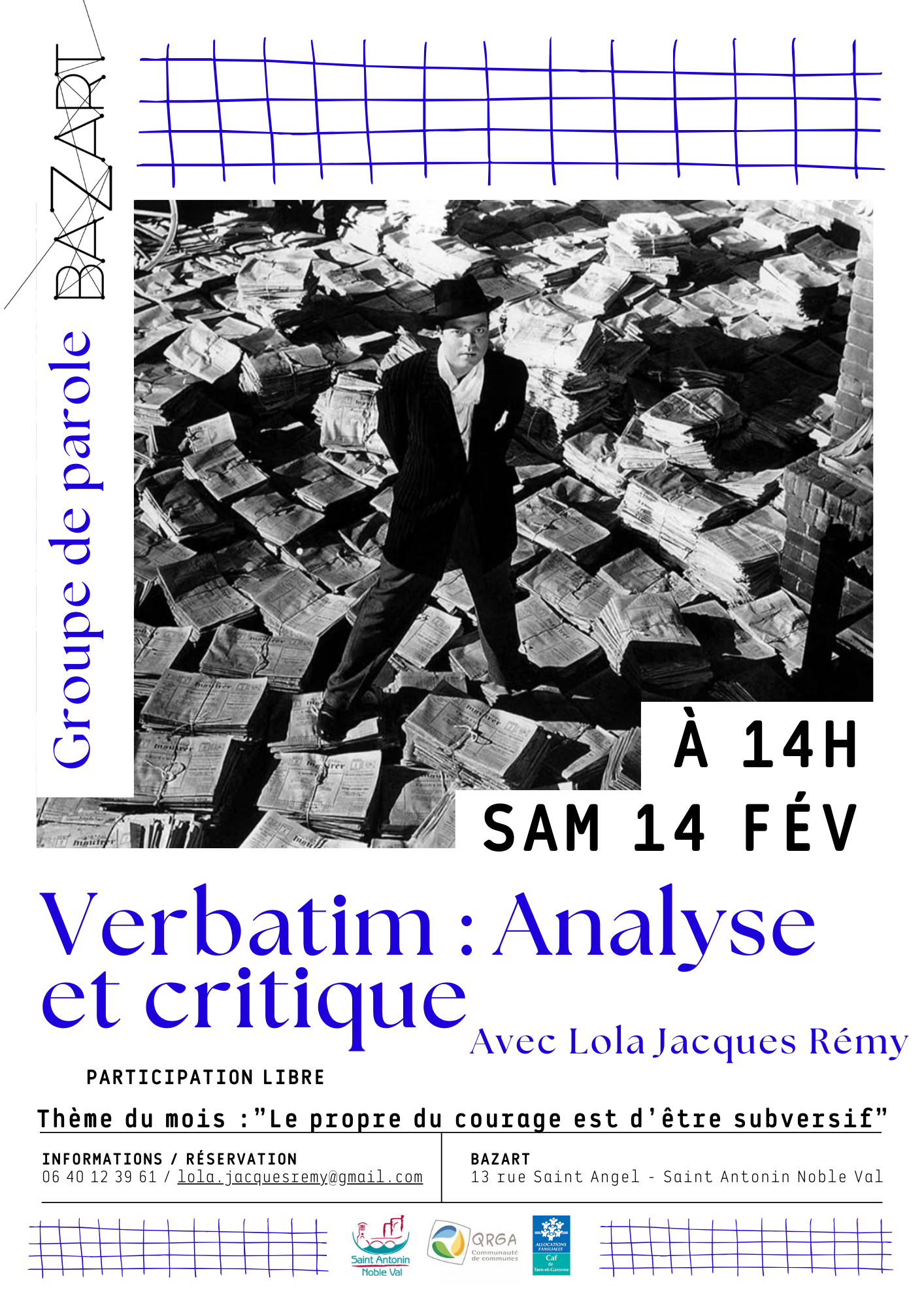 Ces rencontres mensuelles proposeront aux participants d'analyser et critiquer des verbatim pris dans la presse. Le but de ce groupe de paroles est d'échanger à partir des ces petits bouts de phrases d'interviewés (les verbatims). Ces rencontres mensuelles proposeront aux participants d'analyser et critiquer des verbatim pris dans la presse. Le but de ce groupe de paroles est d'échanger à partir des ces petits bouts de phrases d'interviewés (les verbatims) qui nous ont paru intrigants, plaisants, peut être choquants. Il sera donc question de partir de ce qu'on nous montre à voir dans la presse, ce qui est mis en avant, et qui peut être questionné.