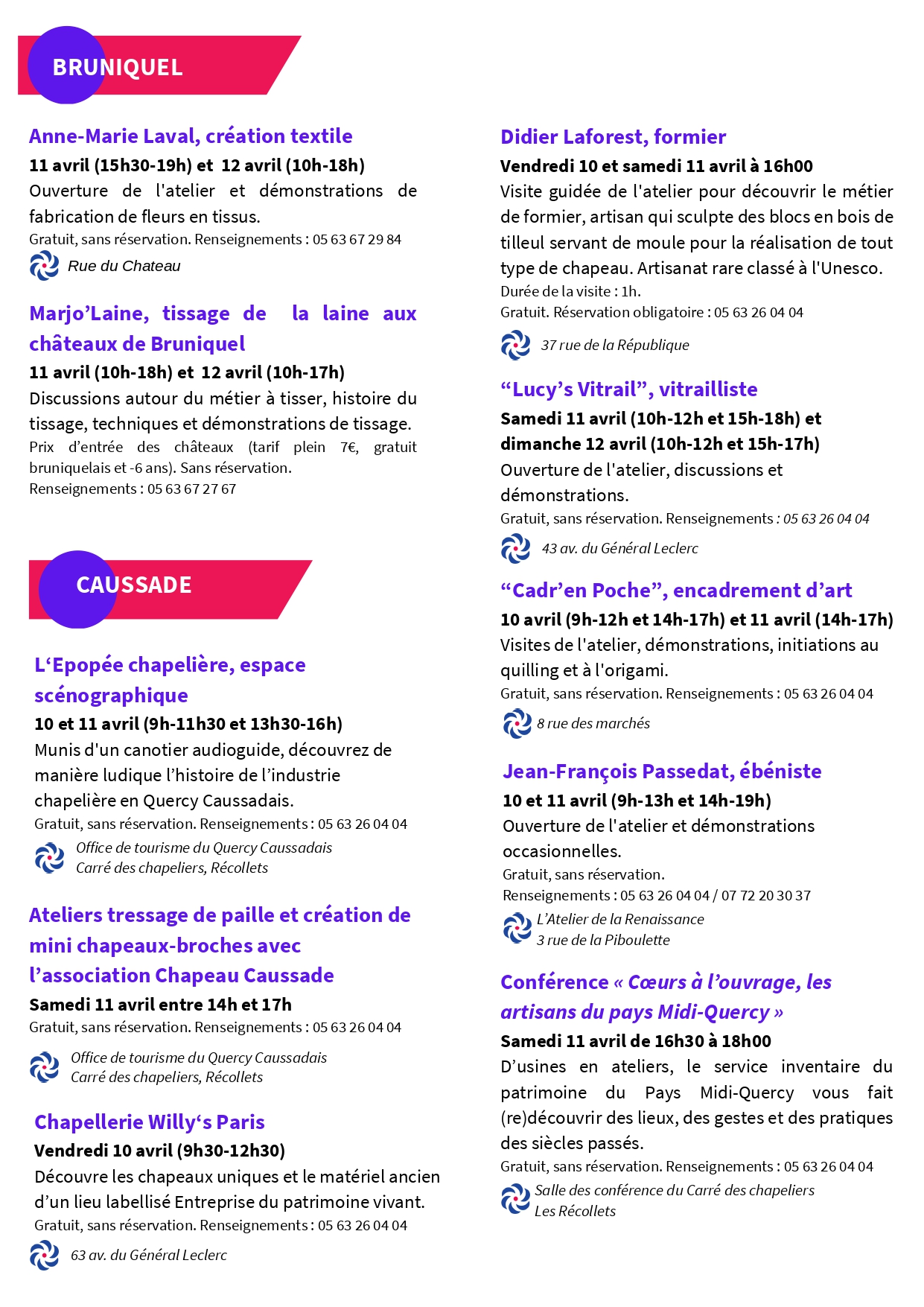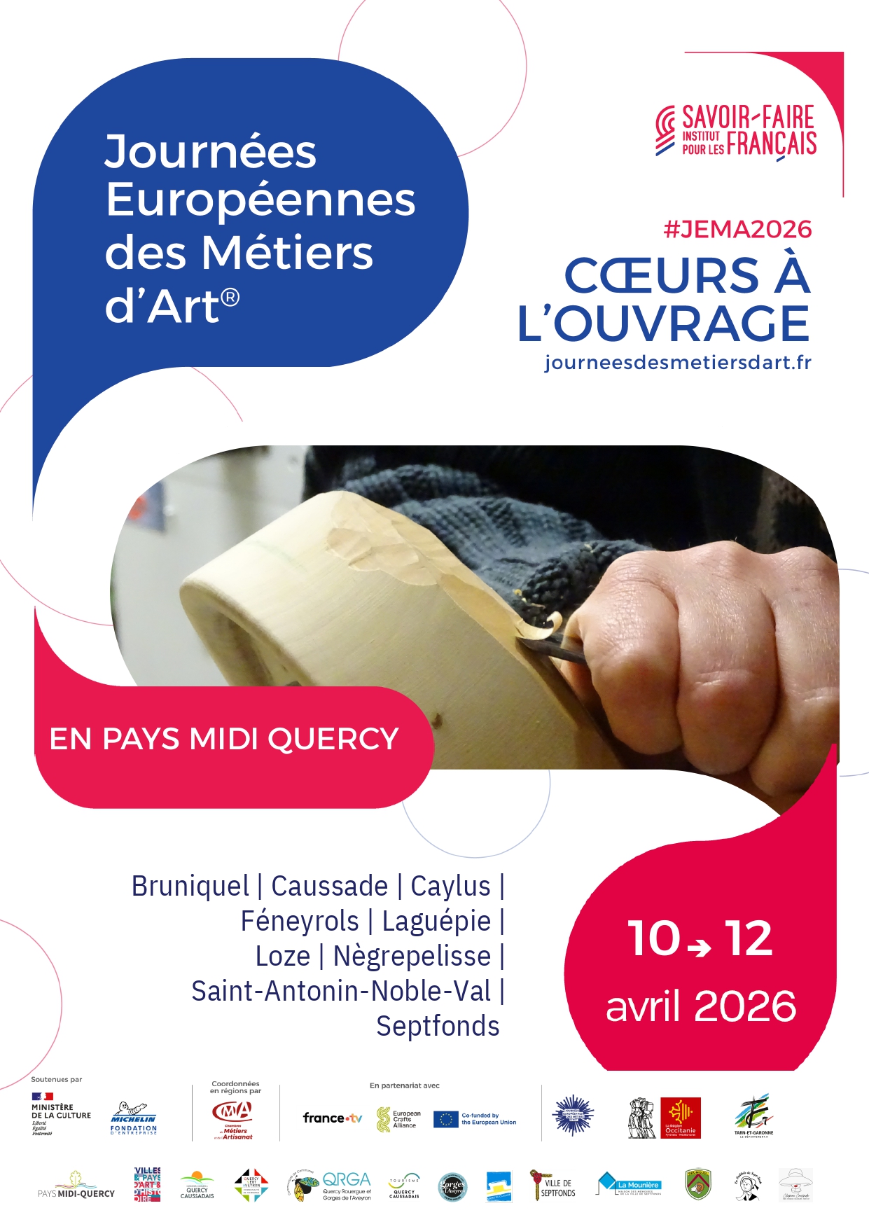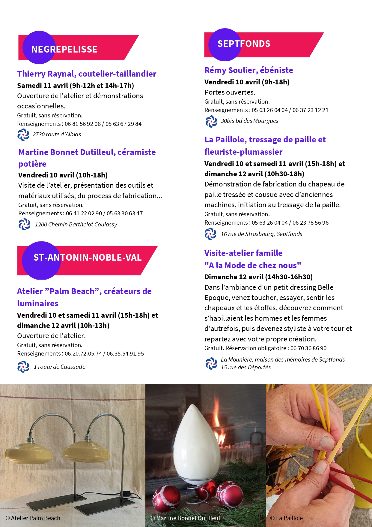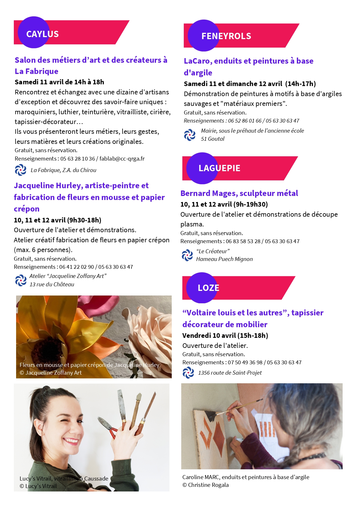 Venez découvrir Salon des métiers d’art et des créateurs à La Fabrique de Caylus ! Salon des métiers d’art et des créateurs à La Fabrique Samedi 11 avril de 14h à 18h Rencontrez et échangez avec une dizaine d’artisans d’exception et découvrez des savoir‑faire uniques : maroquiniers, luthier, teinturière, vitrailliste, cirière, tapissier‑décorateur… Ils vous présenteront leurs métiers, leurs gestes, leurs matières et leurs créations originales. -Teilo : maroquinerie -Tiele Hazenbroek : luthier - Anna O'nneil : teinturière - Charline Alet : vitrailliste - Clara Garrigues : maroquinerie - Lucy Authié : cirière - Stéphanie Rondard : matiériste coloriste en décor mural - "Voltaire, Louis et les autres" : tapissier-décorateur de meubles Gratuit, sans réservation Organisé par L'office de tourisme Causses et Gorges de l'Aveyron, le PETR du Pays Midi-Quercy et la Chambre des métiers et de l'artisanat.