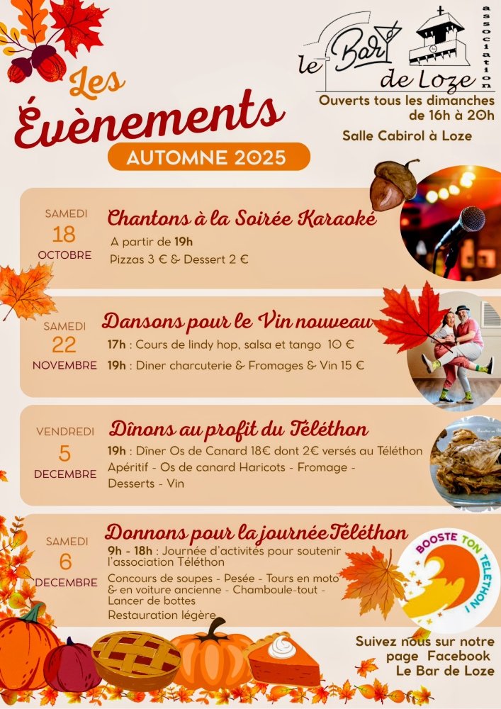 Le Bar associatif de Loze propose cet automne 2025 une série d’événements conviviaux : bal du vin nouveau, dîner au profit du Téléthon et journée d’activités solidaires. Voici le planning des évènements du Bar associatif de Loze pour l'automne 2025.