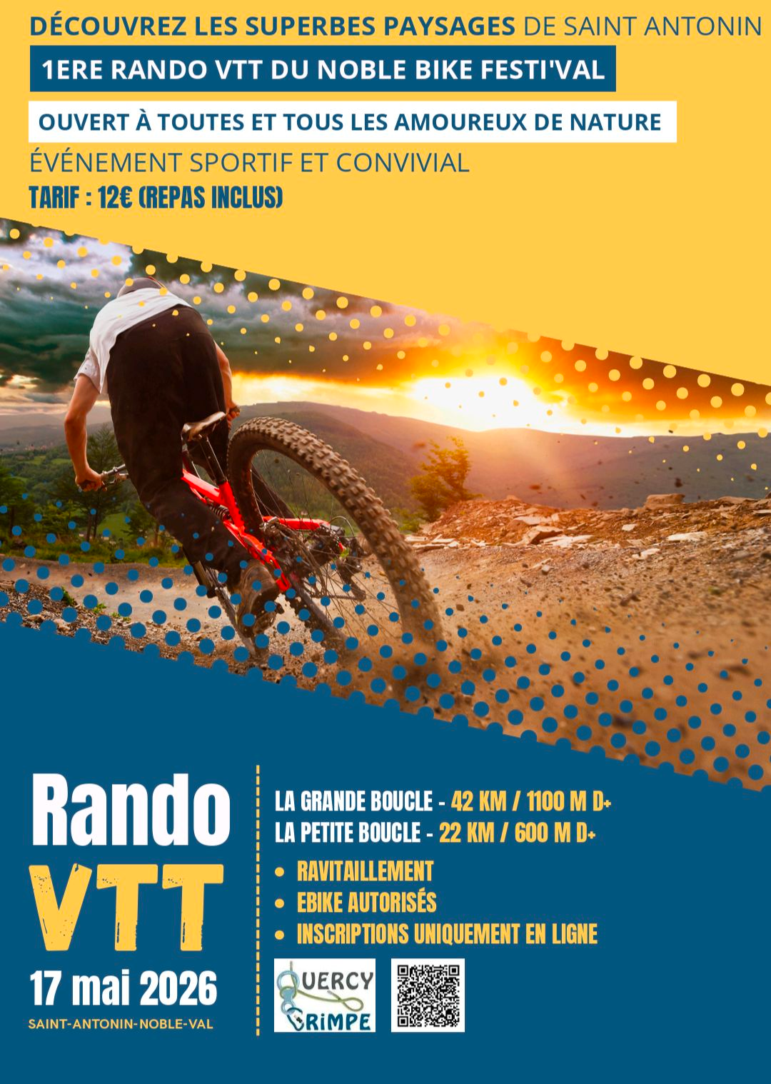 Découvrez les superbes paysages de Saint-Antonin lors de la 1ère Rando VTT du Noble Bike Festi'val. Un événement sportif et convivial, ouvert à toutes et tous les amoureux de nature. 14 et 17 mai 2026 - Place du Pradel JEUDI 14 MAI TOUTE LA JOURNÉE Pumptrack tous ages Parcours ludique enfants Bourse aux vélos / bike test Stand décoration de vélos Food truck & buvette 16H00 Défilé vélo décorés DIMANCHE 17 MAI - DÉPART 9H Rando sportive vtt dual slalom (parcours rando) 22km 600md+ - 42km 1100md+ Ebike autorisés inscription limitées à 150 coureurs! 12€ repas compris