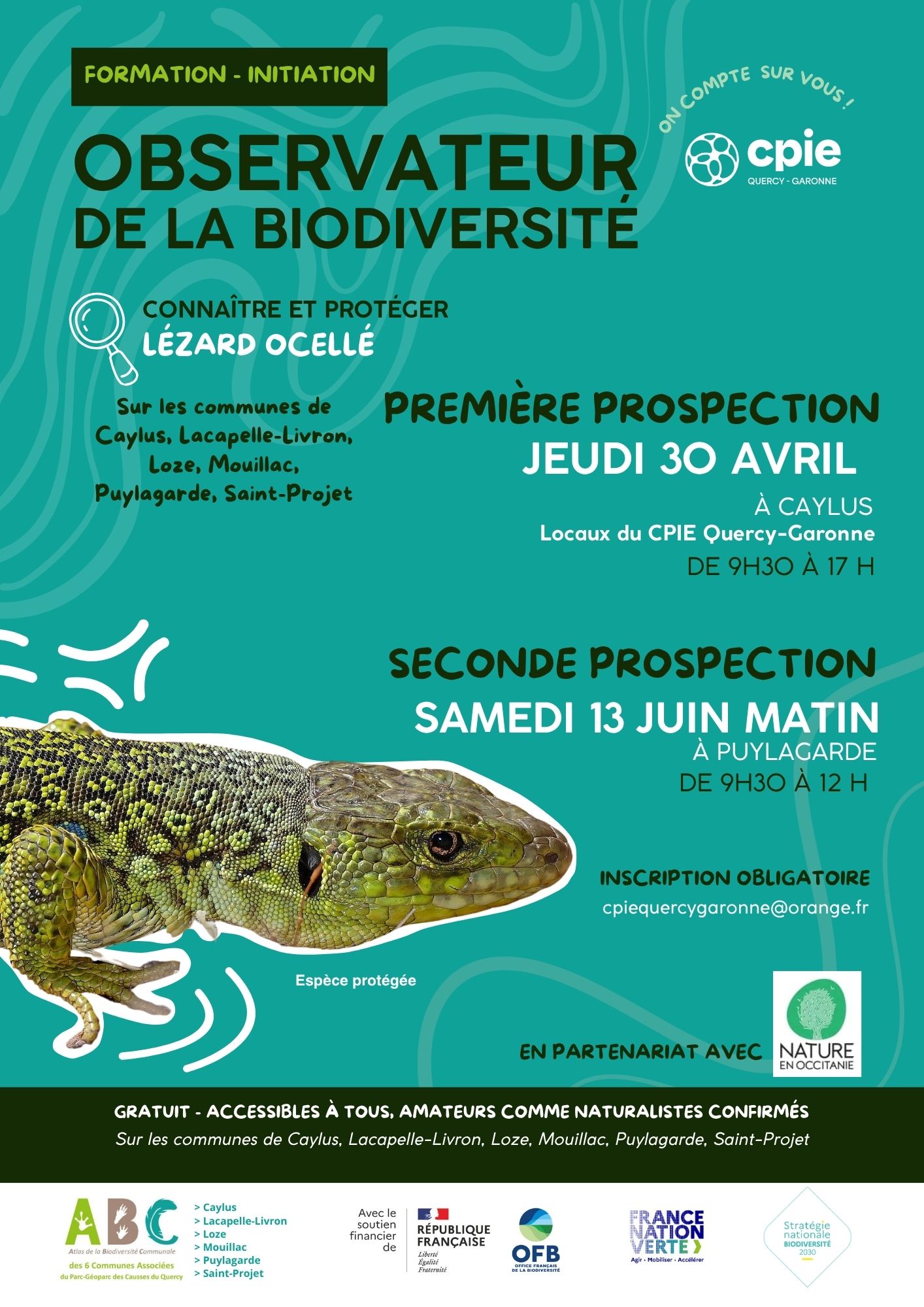 Formation-initiation pour connaître et protéger le lézard ocellé, une espèce protégée. Participez à une formation-initiation pour devenir observateur de la biodiversité et apprendre à connaître et protéger le lézard ocellé, une espèce protégée. Deux prospections sont organisées : la première le jeudi 30 avril à Caylus, aux locaux du CPIE Quercy-Garonne, de 9h30 à 17h, et la seconde le samedi 13 juin matin à Puylagarde, de 9h30 à 12h. L'inscription est obligatoire et se fait par email. Cet événement est gratuit et accessible à tous, amateurs comme naturalistes confirmés, et se déroule sur les communes de Caylus, Lacapelle-Livron, Loze, Mouillac, Puylagarde, Saint-Projet.