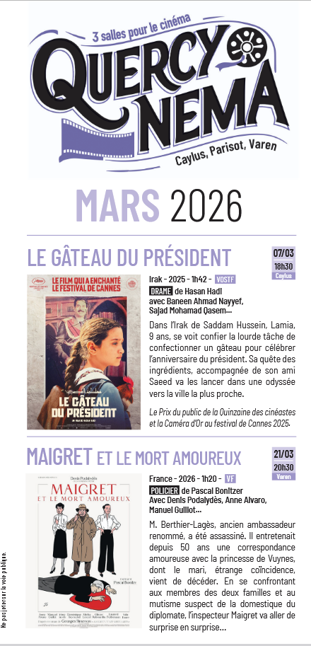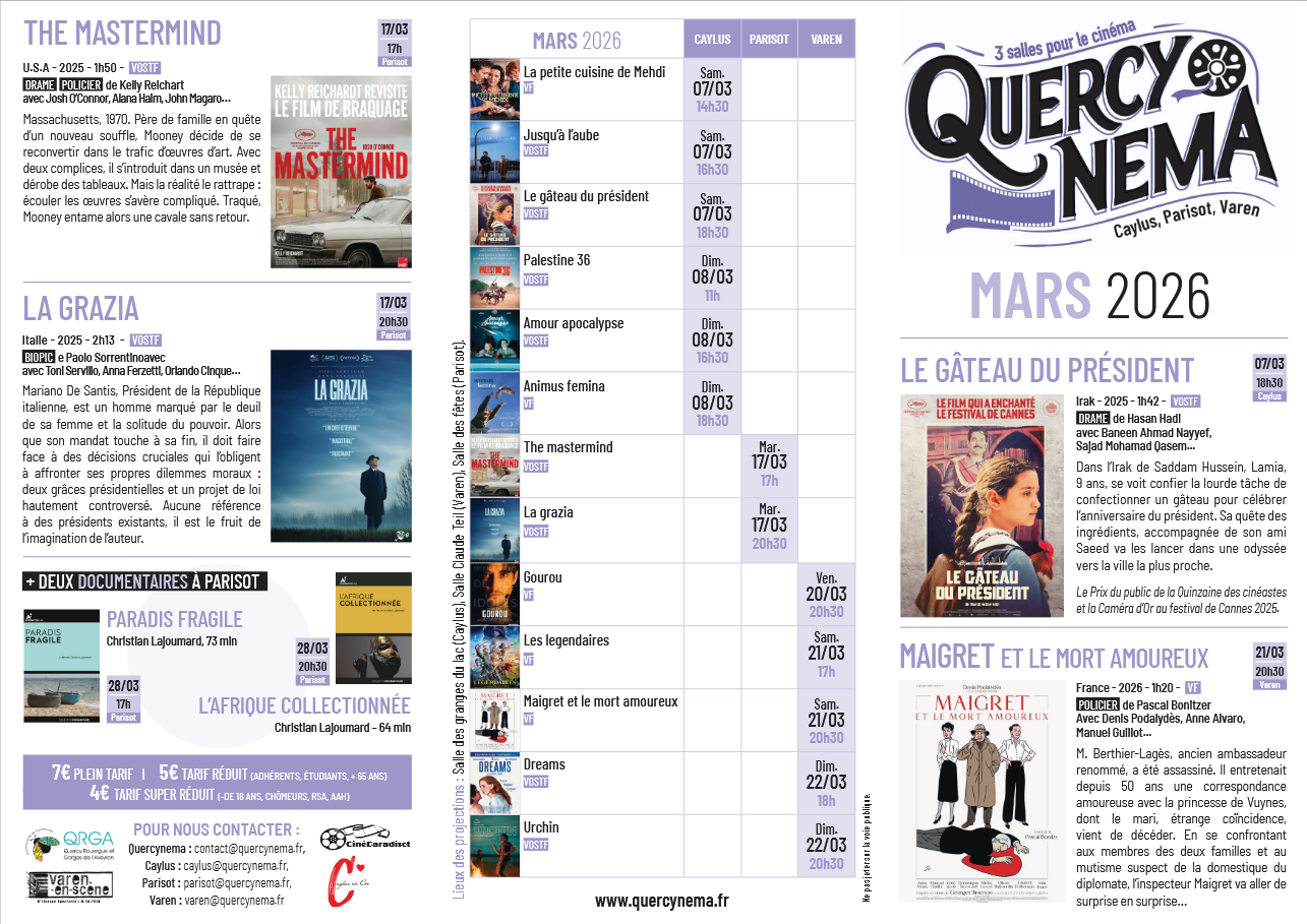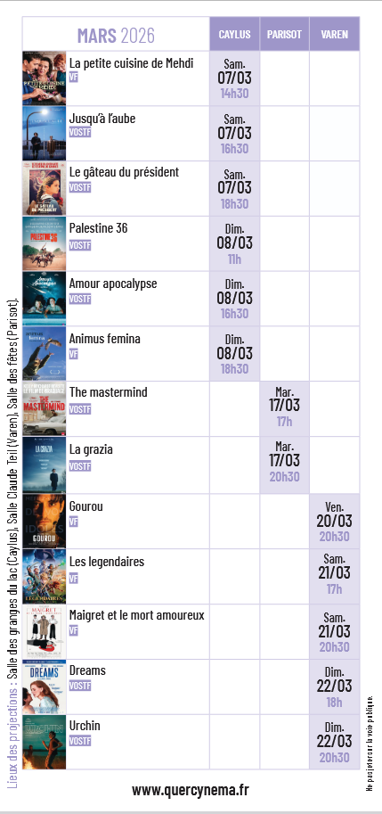 Programme du mois de Mars pour Varen Vendredi 20/03 à 20h30 GOUROU VF Samedi 21/03 à 17h00 LES LÉGENDAIRES VF Samedi 21/03 à 20h30 CHERS PARENTS VF Dimanche 22/03 à 18h00 DREAMS VOSTF Dimanche 22/03 à 20h30 URCHIN VOSTF
