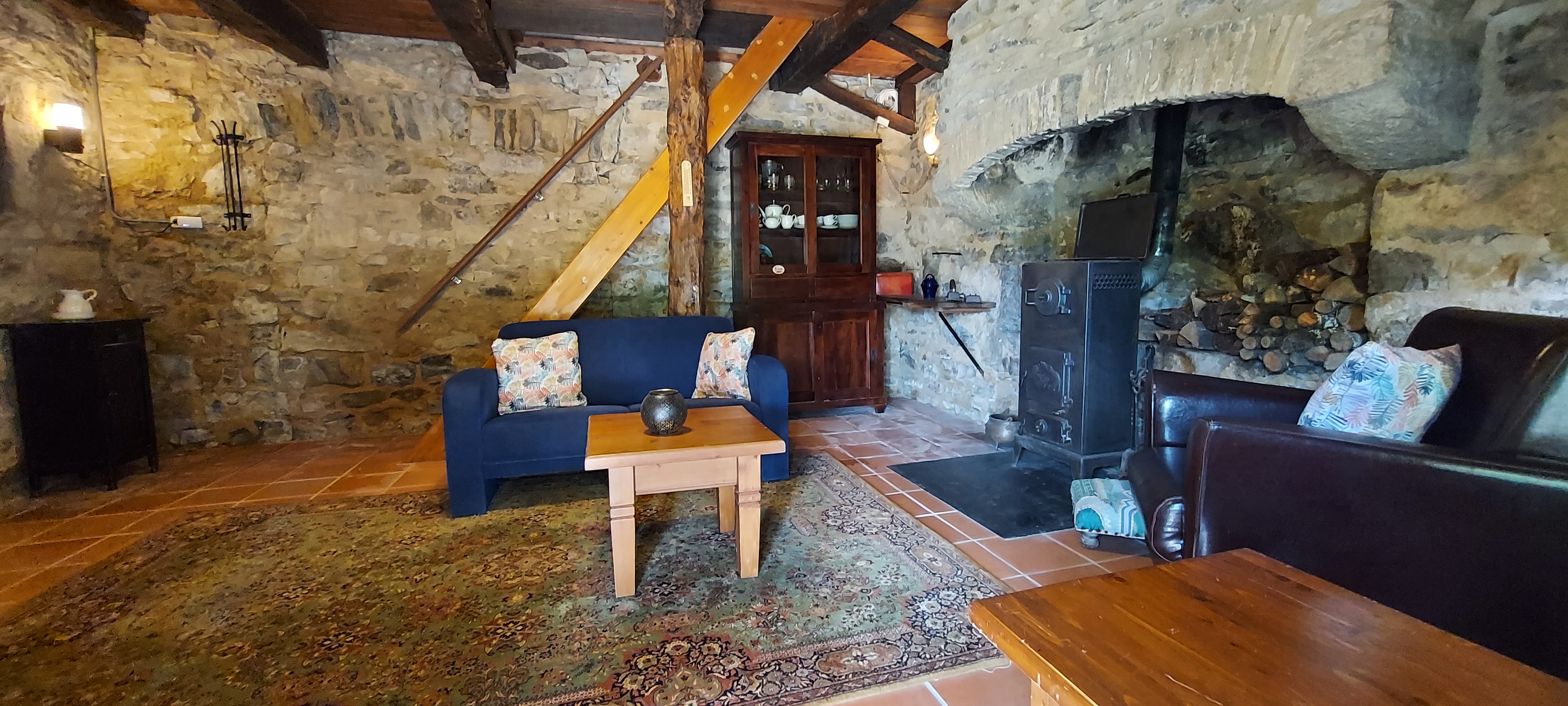 - Au rez-de-chaussée : un salon confortable, une cuisine entièrement équipée avec table à manger, réfrigérateur, cuisinière, four, cafetière et bouilloire.