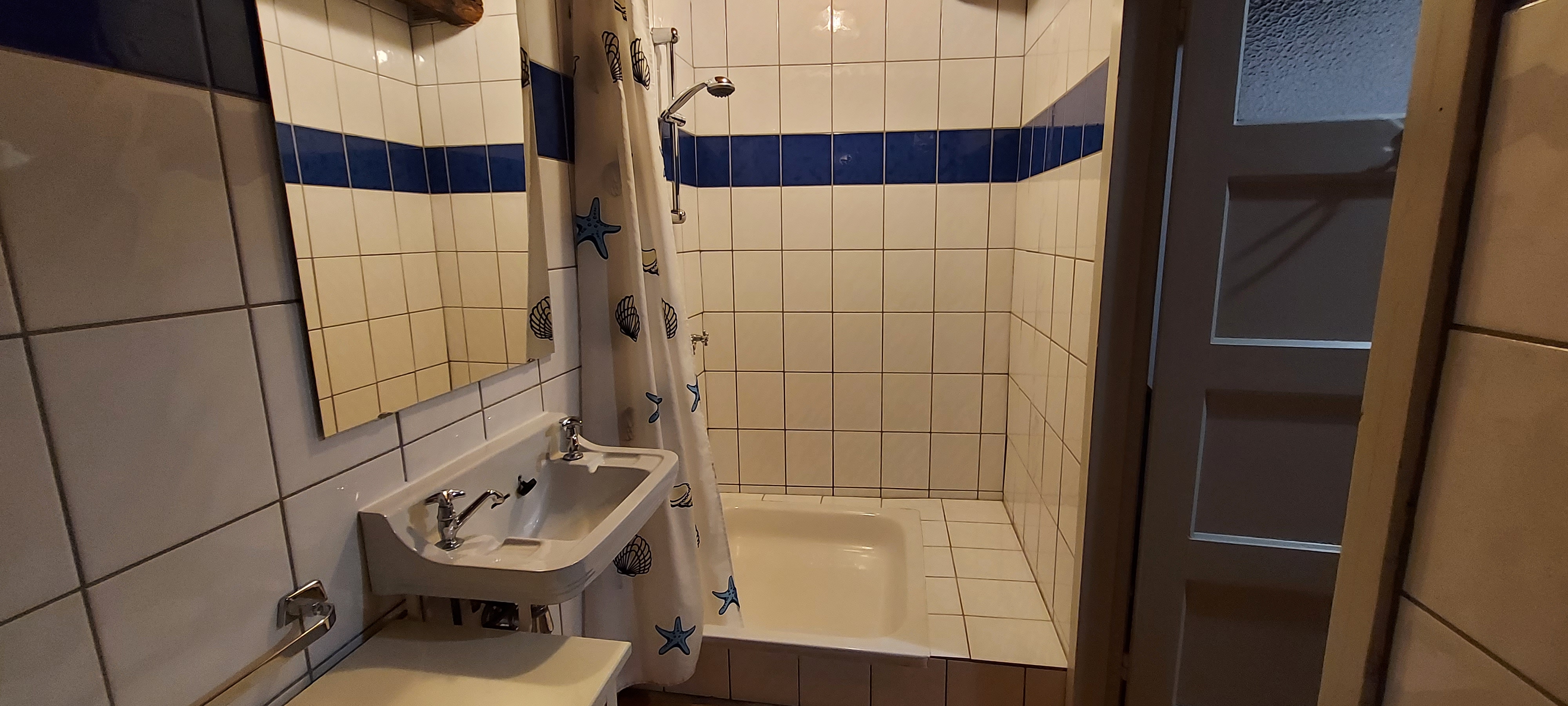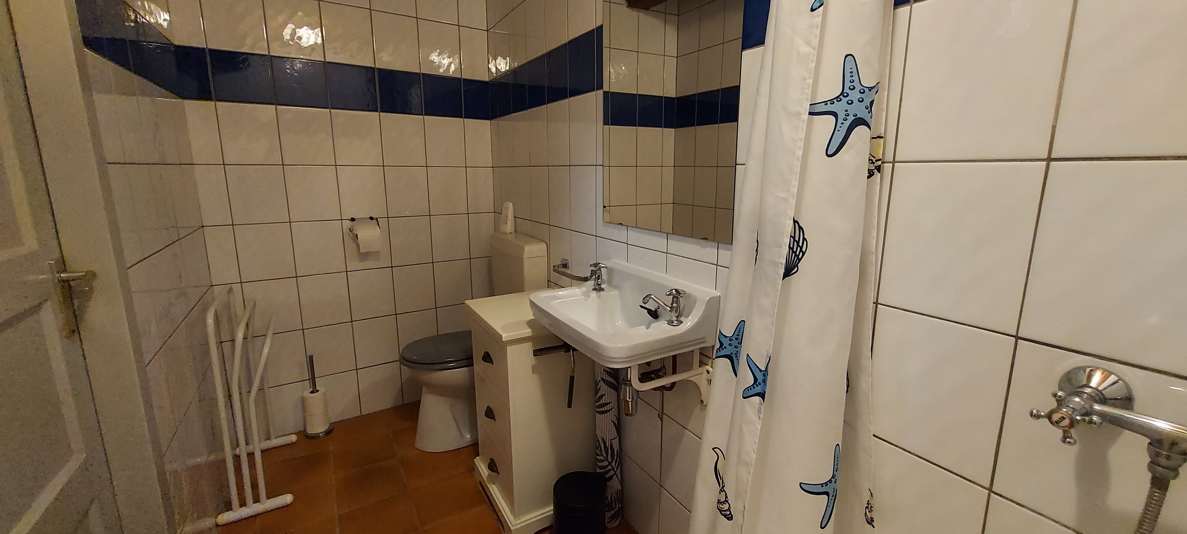 Salle de bain avec douche, lavabo et toilettes.