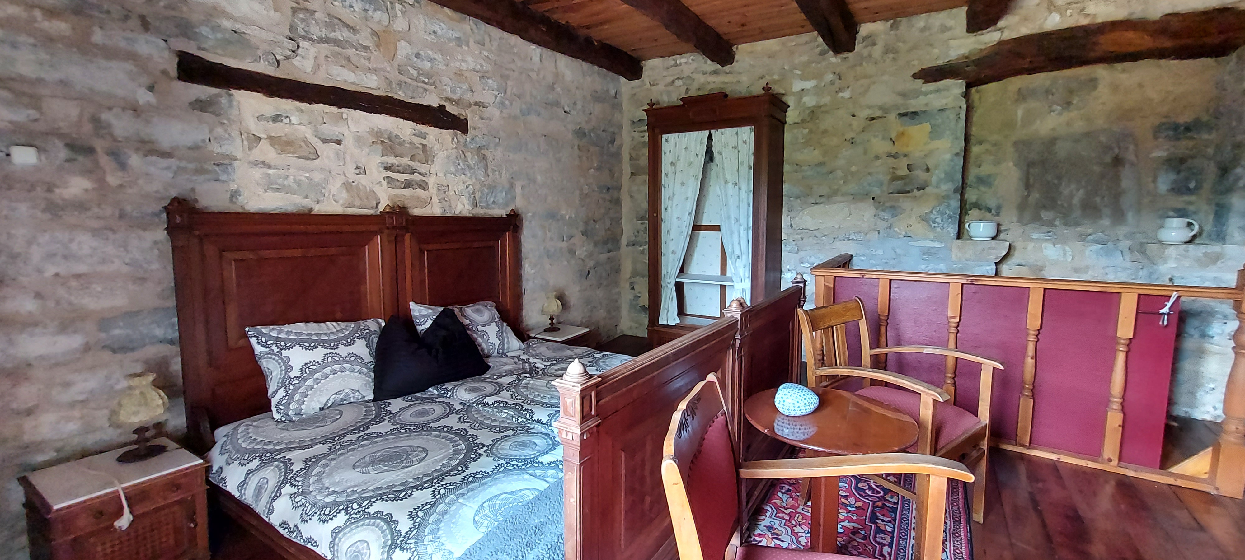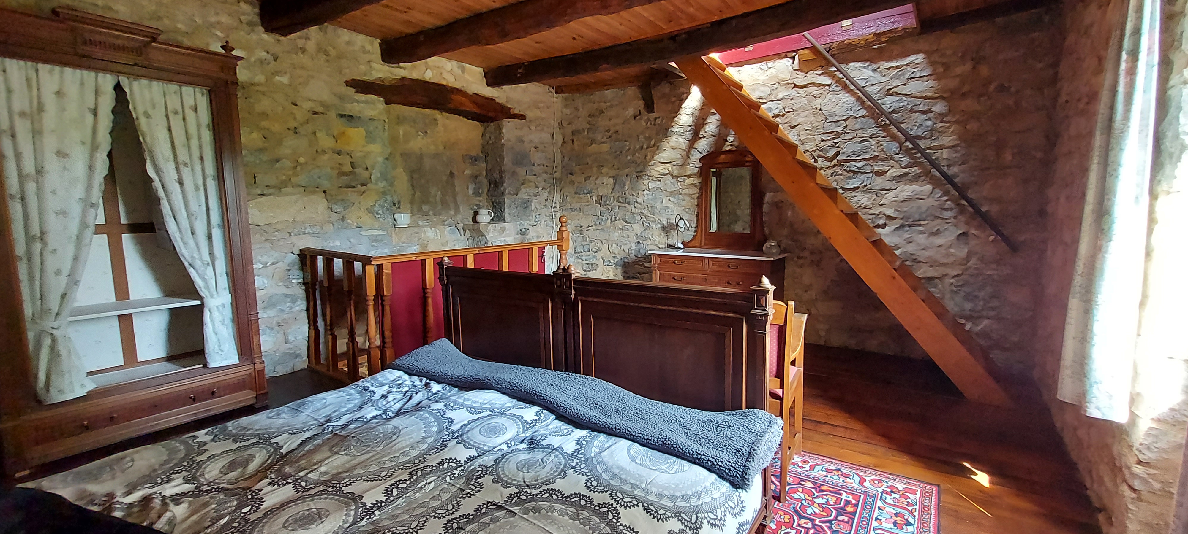 - À l’étage : une grande chambre avec un lit double, une armoire et une commode.
