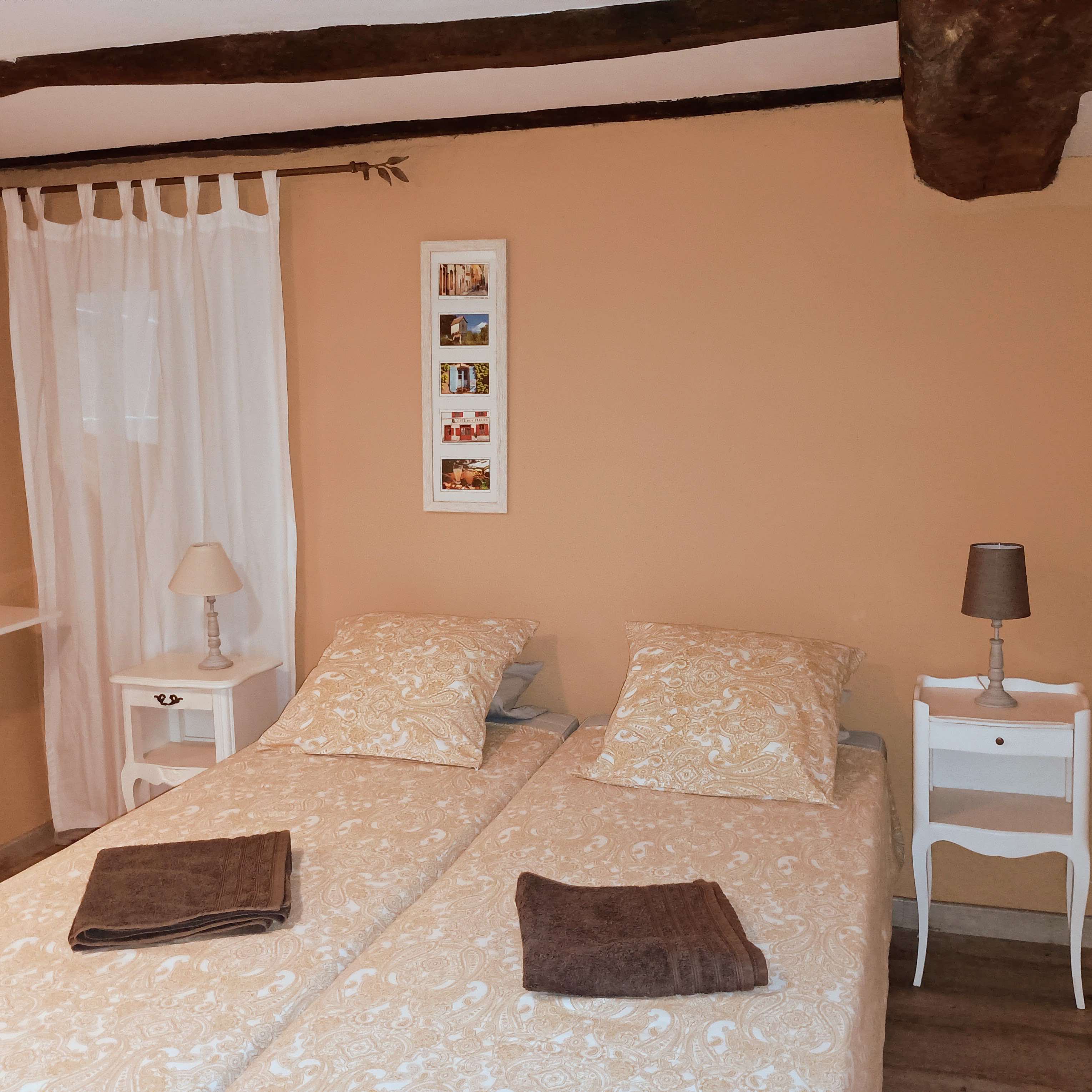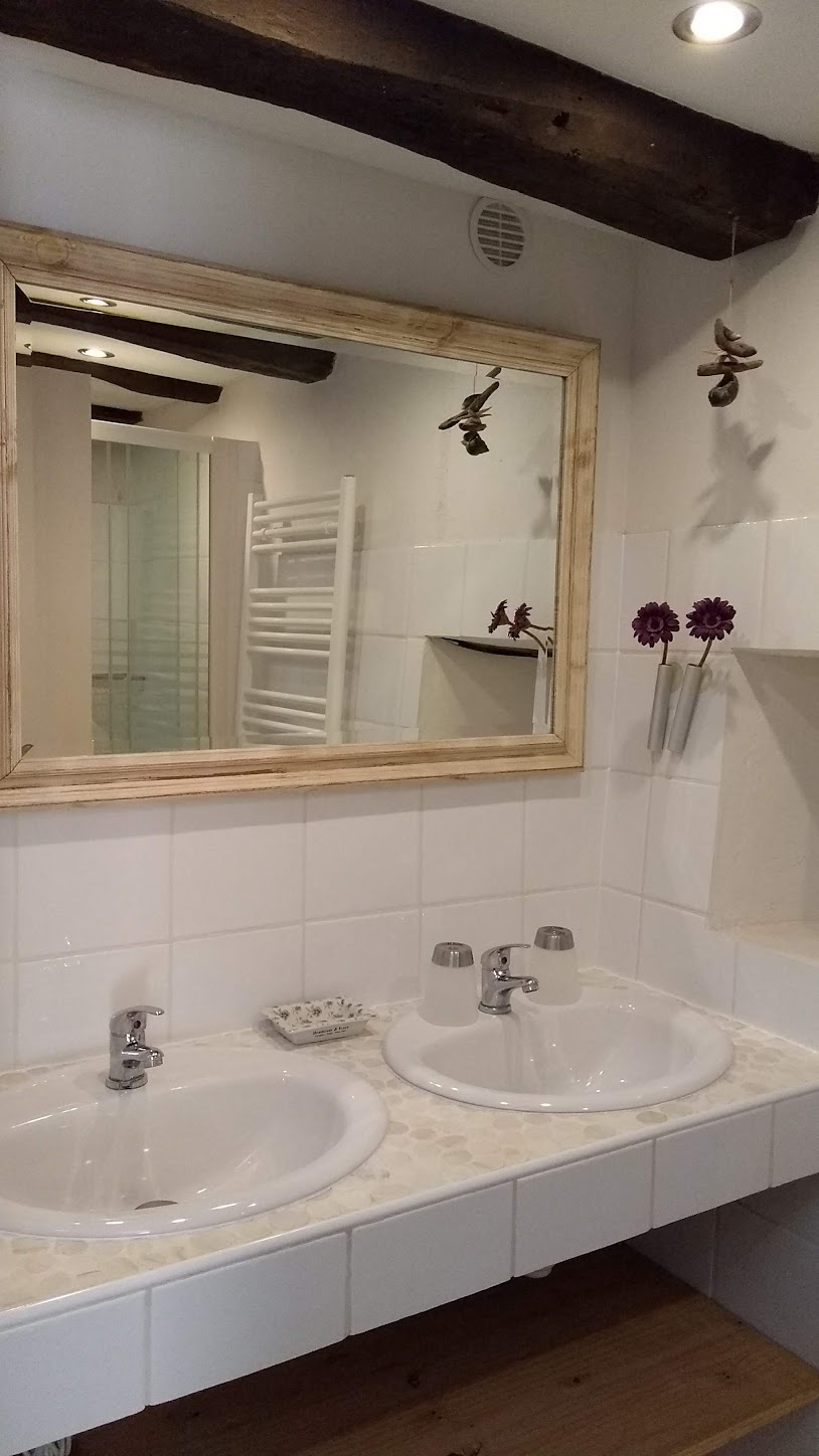 La chambre est équipée de deux lits simples qui peuvent être accolés, d'une commode ainsi que d'une armoire ancienne. De la chambre vous avez accès à des toilettes séparées et à une salle d’eau munie d'une douche à l'italienne, de deux lavabos et d'un et sèche-serviette.