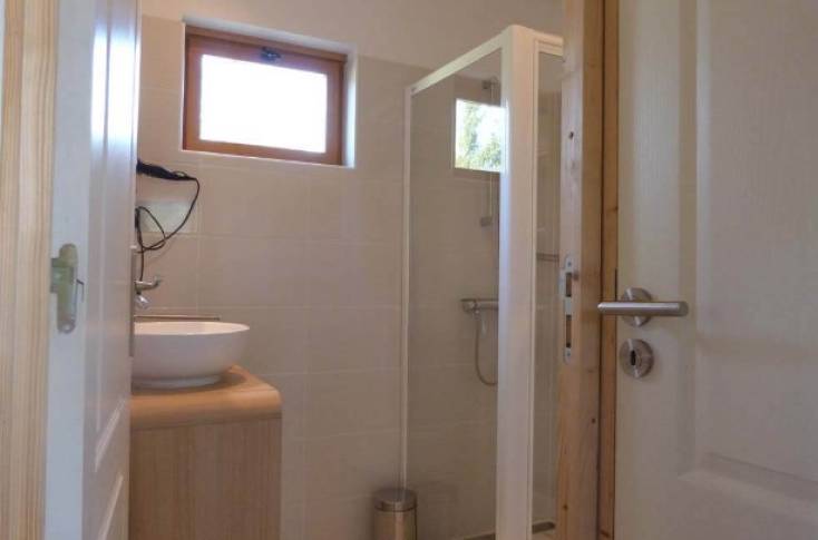 La maisonnette dispose de 2 chambres. 1 chambre avec un lit double et une chambre avec un lit double et un lit simple superposé. Le séjour comprend une cuisine américaine et un espace salon avec un canapé. La cuisine est entièrement équipée avec micro-onde avec grill, grand réfrigérateur, 4 feux à gaz, cafetière…. La salle d’eau est équipée d’une douche à l’italienne moderne. La toilette séparée est située à coté de la salle d’eau.