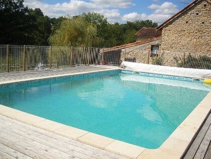 La piscine est clôturée et mesure 6 x 10 m, de 70 cm à 1.50 m.