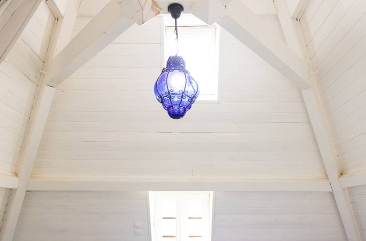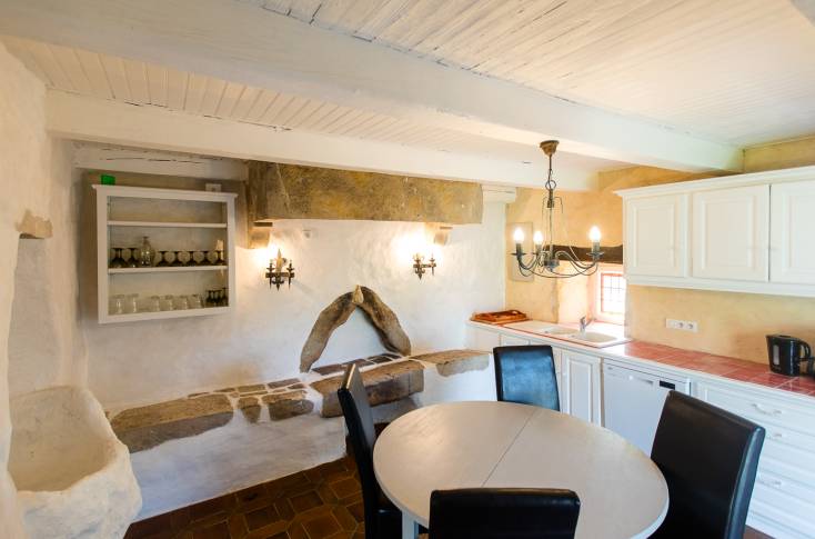 Atmosphère douce et romantique avec son carrelage bleu d’époque, ses murs en pierre, en bois et enduits chaux.