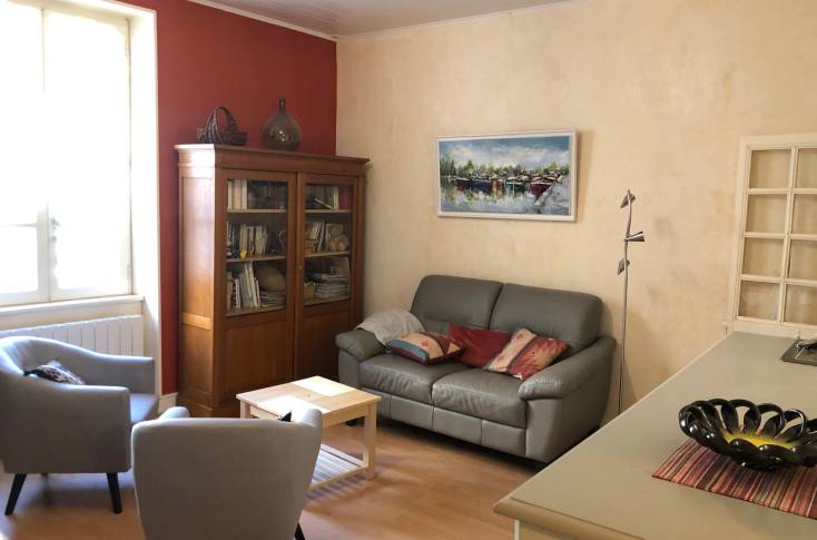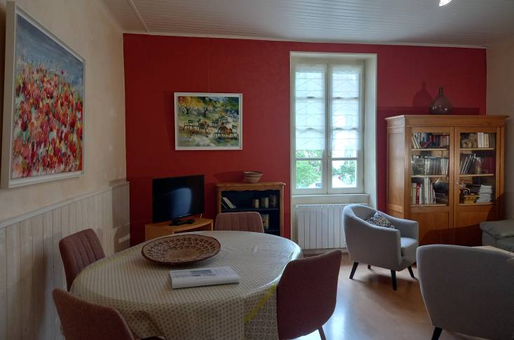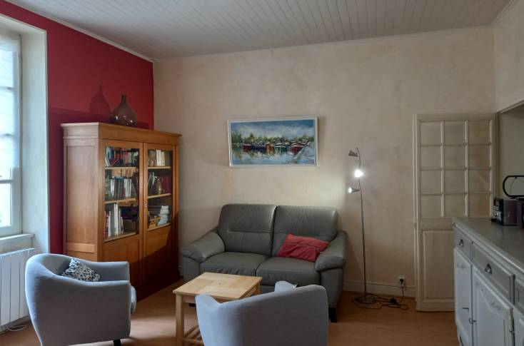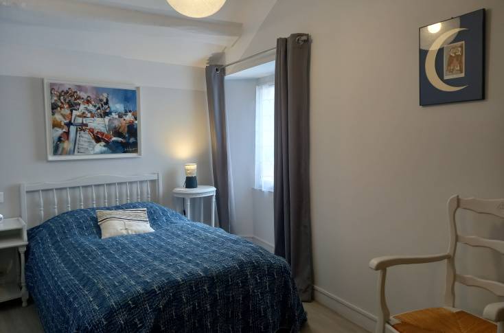 Un bel escalier de bois vous mène au séjour, équipé d'un canapé, fauteuils, tables et chaises, d'une télévision écran plat, bibliothèque et à la cuisine toute équipée. Sur ce même niveau, une chambre avec un lit 140 cm, une salle d'eau et WC séparé.