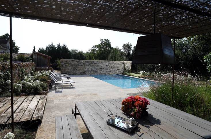 Le mobilier intérieur et extérieur a été réalisé à partir de matériaux anciens revisités. Dans le jardin, plantes aromatiques, graminées et arbres fruitiers dominent, des bruits d'eau et un éclairage soigné confèrent tant le jour que la nuit un charme particulier. L'art de vivre extérieur a été traité comme une priorité dans une maison du sud.