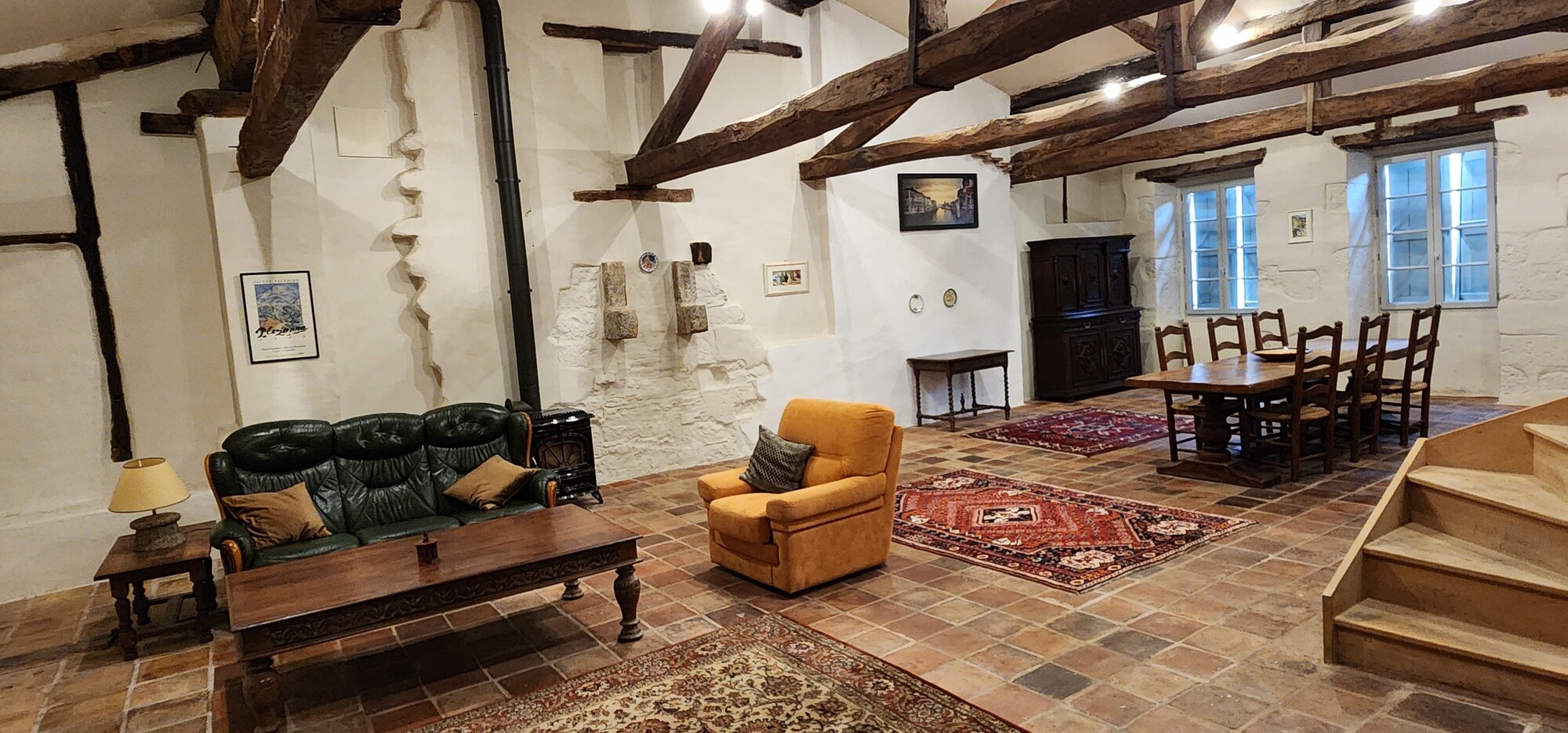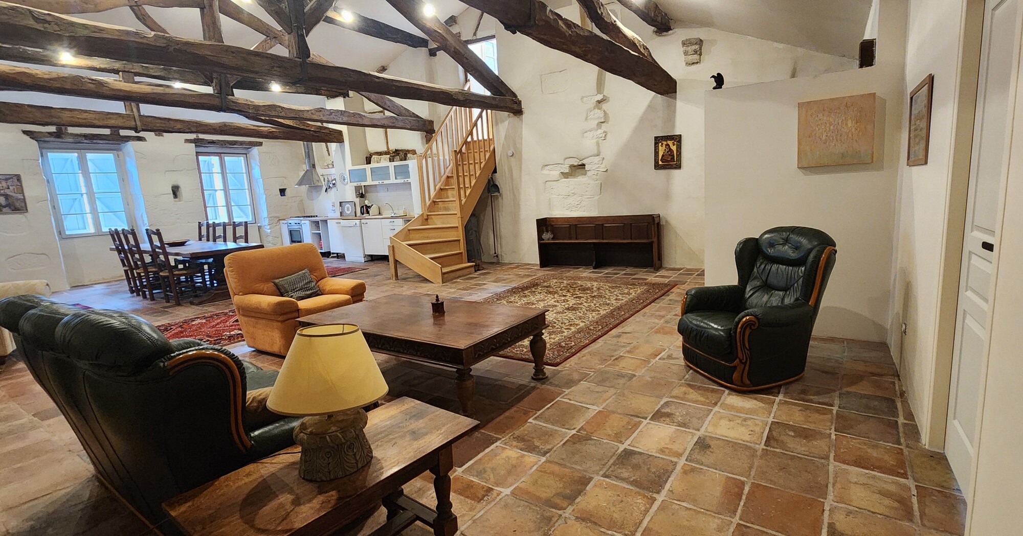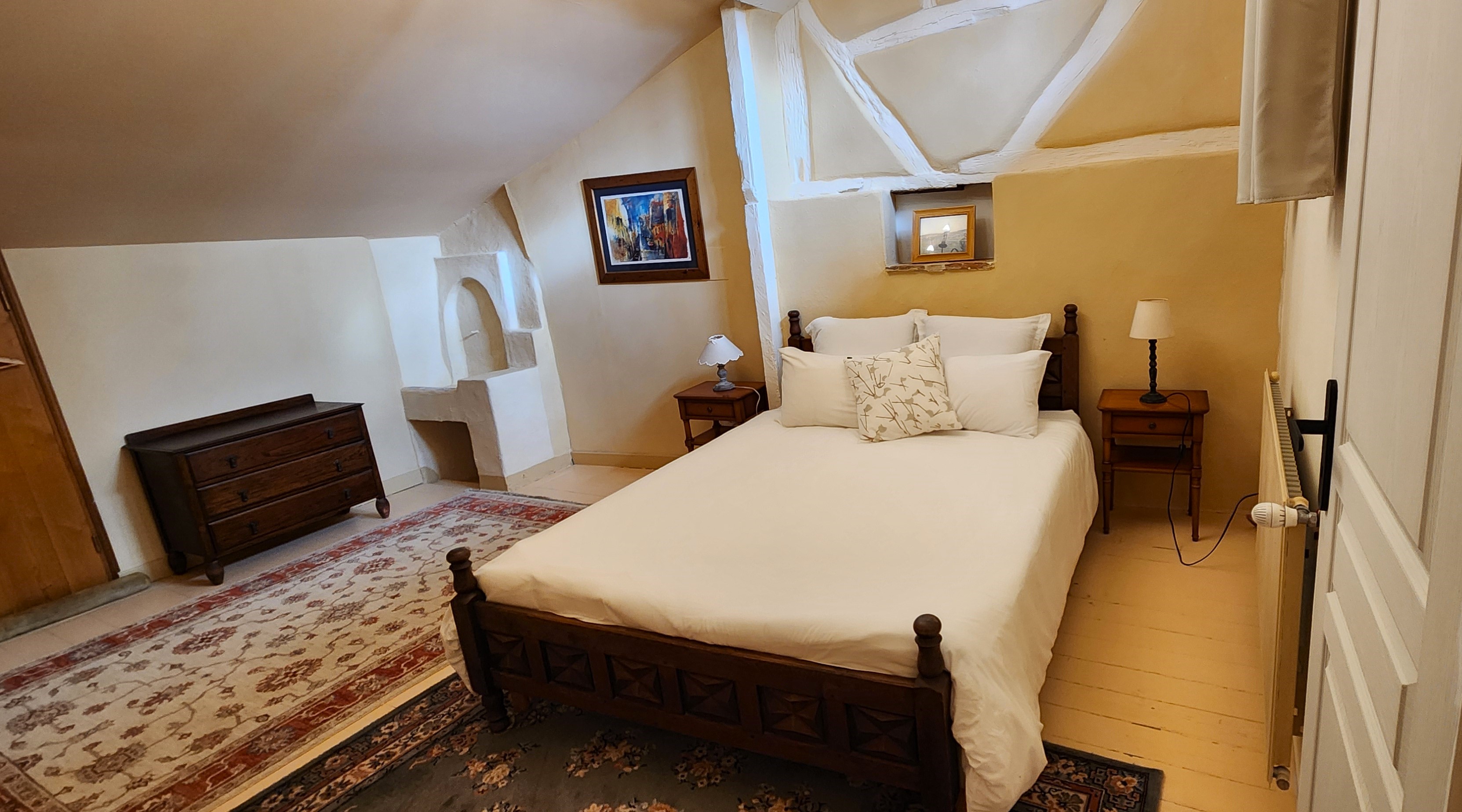 Profitez de l'atmosphère pittoresque et conviviale de notre gite historique au centre d'un pittoresque village français. Toute l'année, profitez des équipements et services 3 étoiles de nos 2 appartements avec nos savoureux petits déjeuners. Au 3ème étage, après la porte ancienne, rentrez dans la pièce de vie avec cuisine intégrée (lave-vaisselle, réfrigérateur, gazinière gaz, four électrique, congélateur), espace repas table et chaises pour 6 personnes, un espace salon (canapé, fauteuils, table basse), et une chambre ( 3 lits 90) pour 3 personnes. Après l'escalier intérieur, accéder à la chambre ( 1 lit 160), une salle de bain avec wc. Linge de lit et de toilette fournis compris dans le prix.