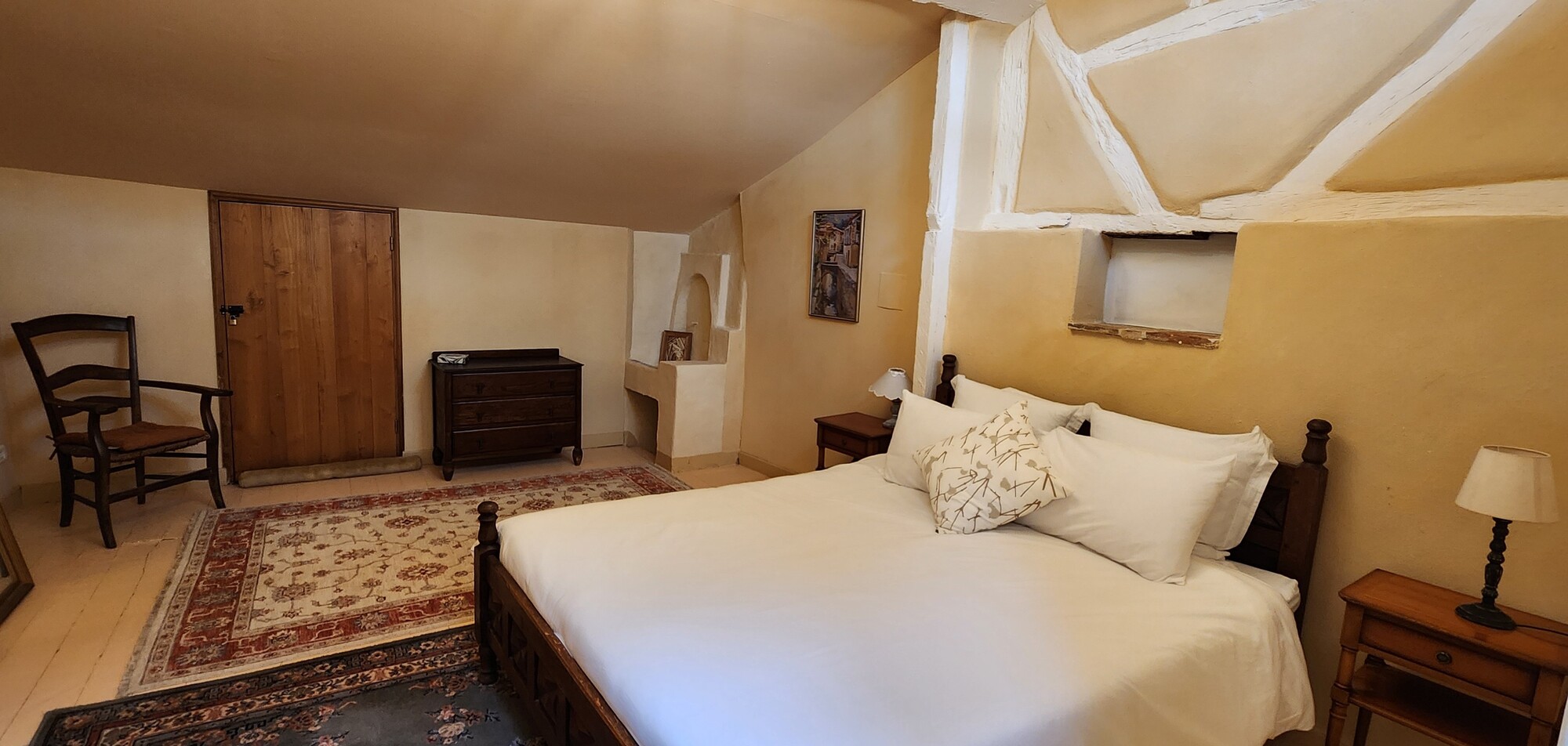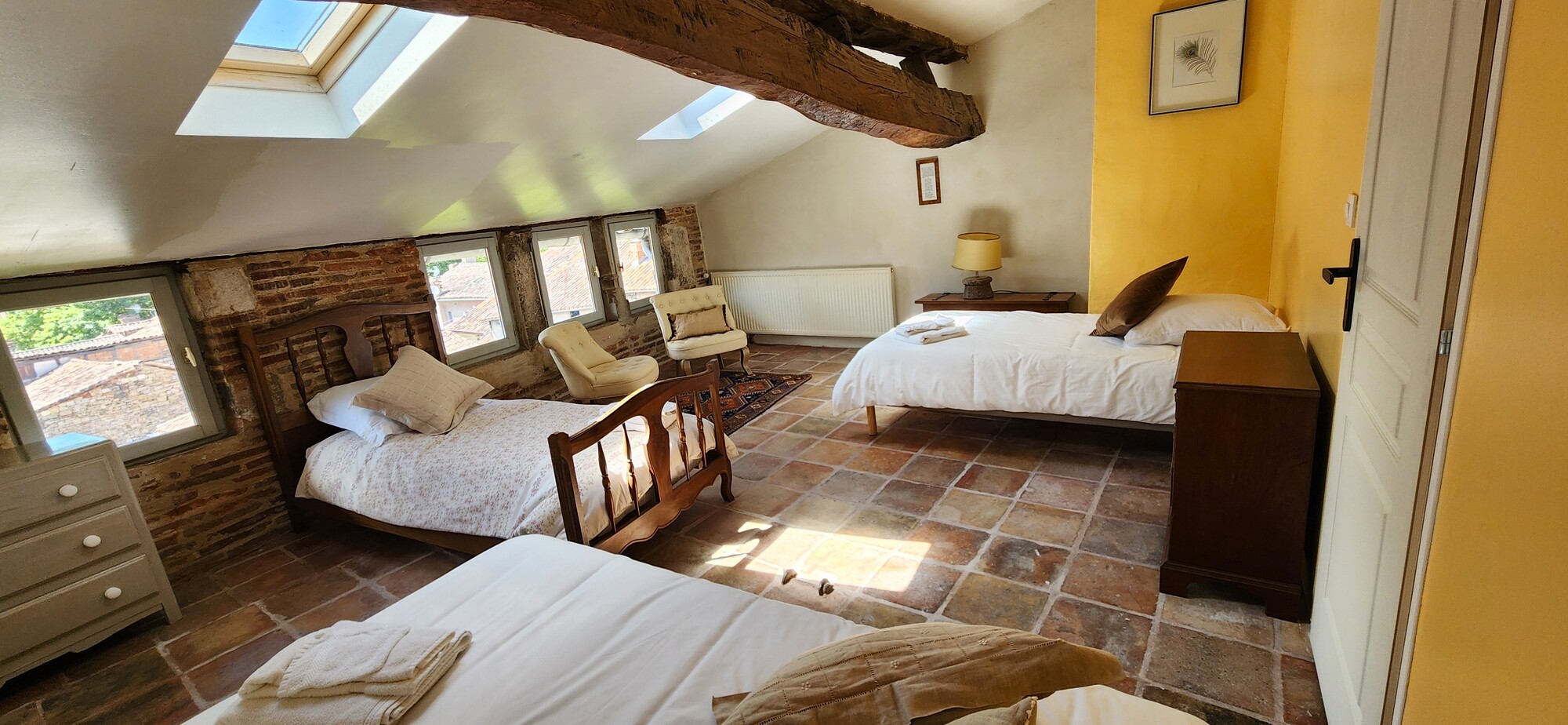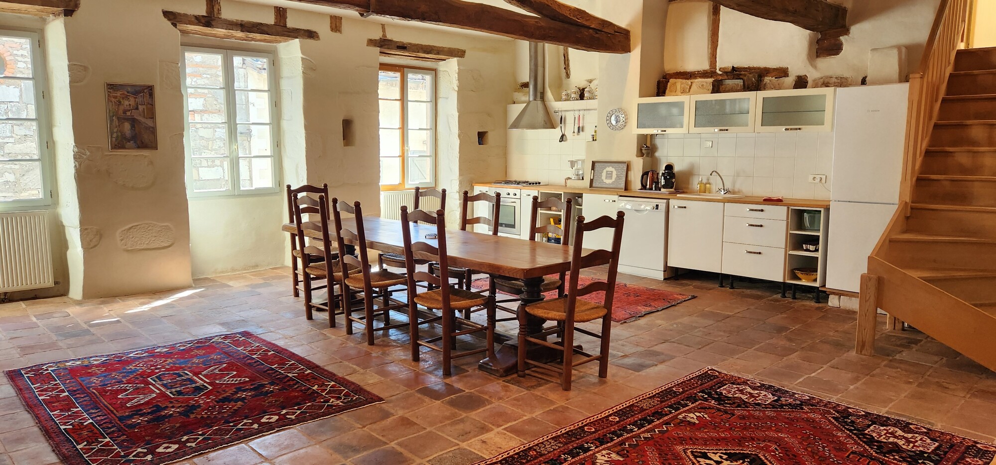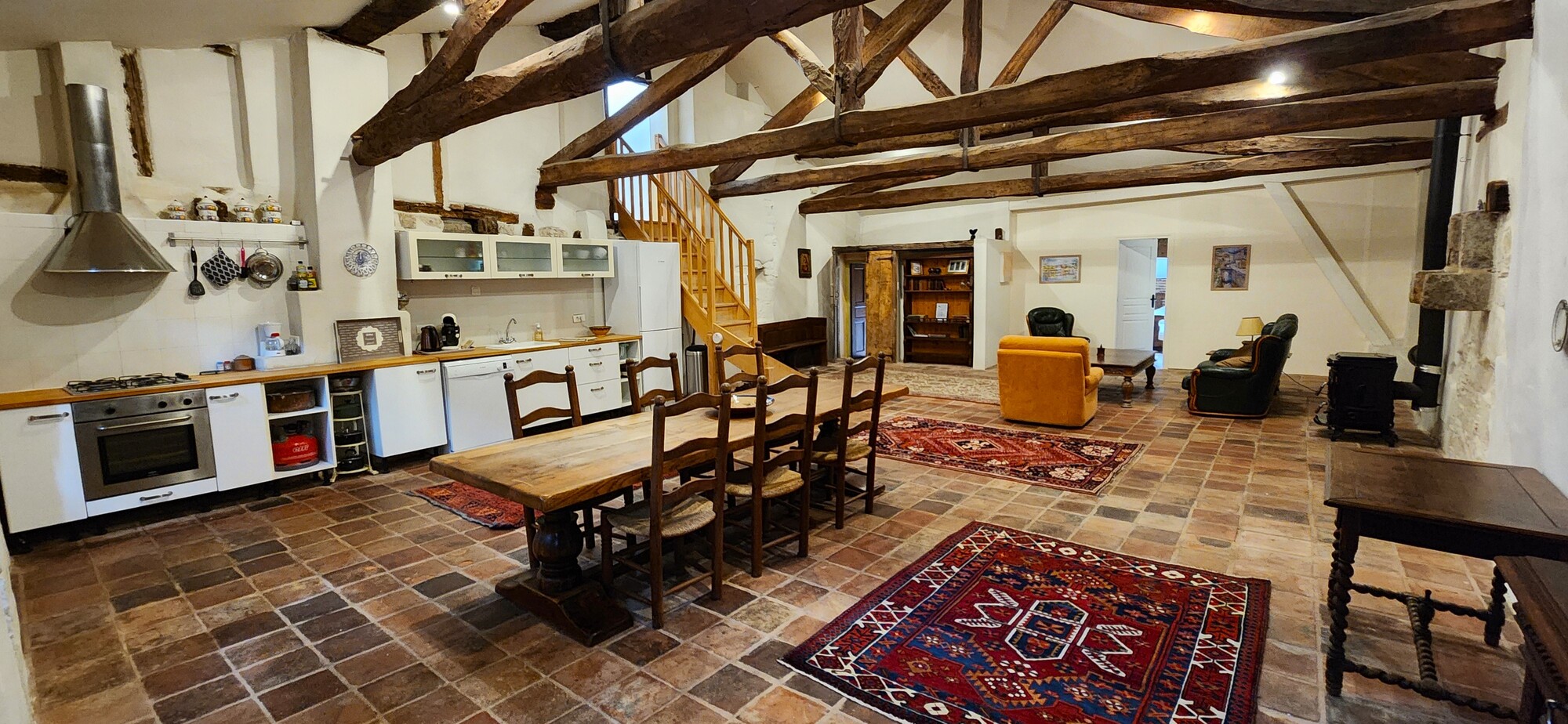 Profitez de l'atmosphère pittoresque et conviviale de notre gite historique au centre d'un pittoresque village français. Toute l'année, profitez des équipements et services 3 étoiles de nos 2 appartements avec nos savoureux petits déjeuners. Au 3ème étage, après la porte ancienne, rentrez dans la pièce de vie avec cuisine intégrée (lave-vaisselle, réfrigérateur, gazinière gaz, four électrique, congélateur), espace repas table et chaises pour 6 personnes, un espace salon (canapé, fauteuils, table basse), et une chambre ( 3 lits 90) pour 3 personnes. Après l'escalier intérieur, accéder à la chambre ( 1 lit 160), une salle de bain avec wc. Linge de lit et de toilette fournis compris dans le prix.