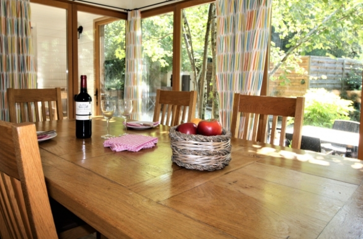 Salle à manger/véranda avec table et chaises pour six personnes.