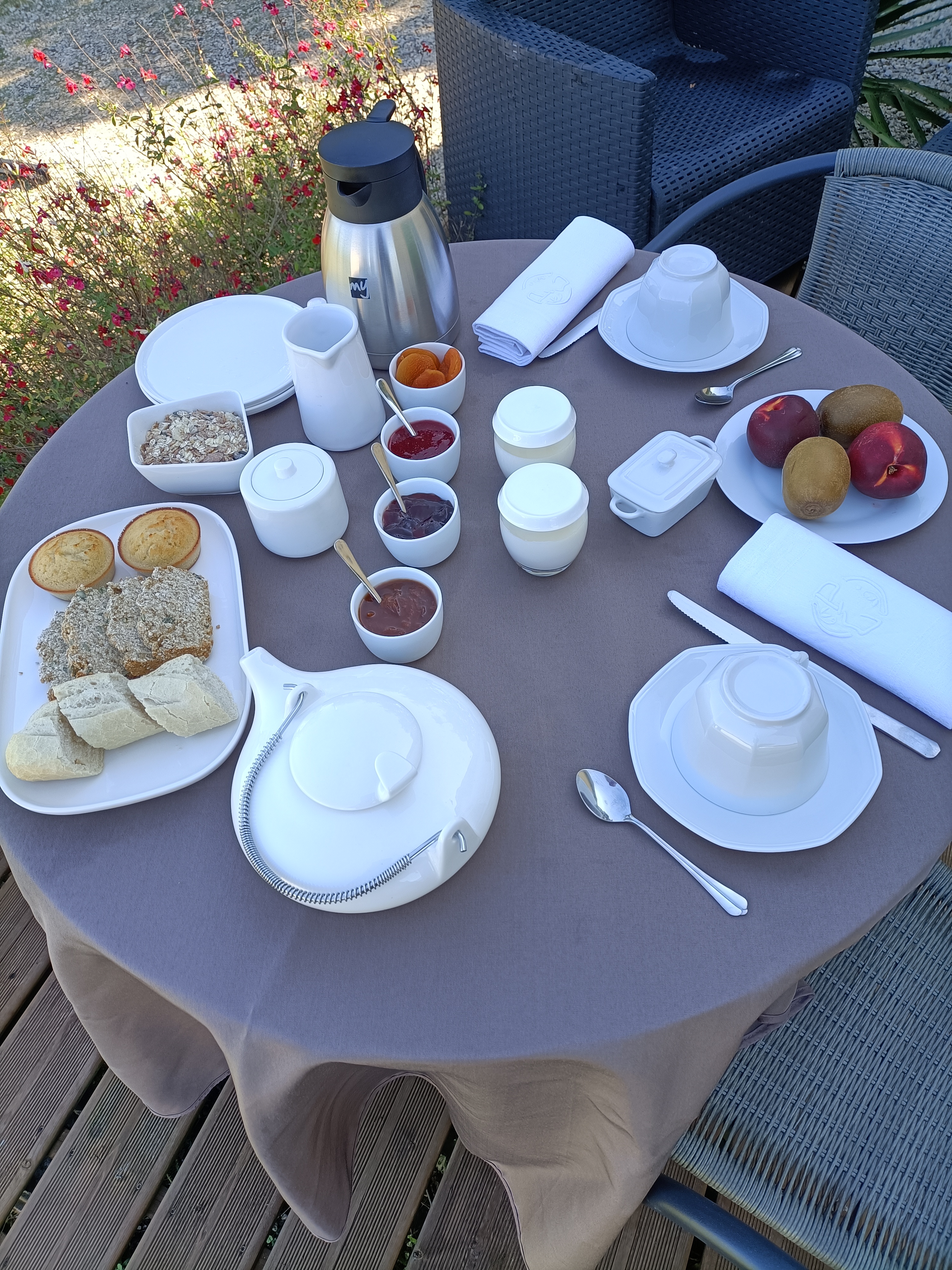 Les petits déjeuners maison sucrés ou salés seront servis sur votre terrasse privée ou dans notre maison selon le temps.