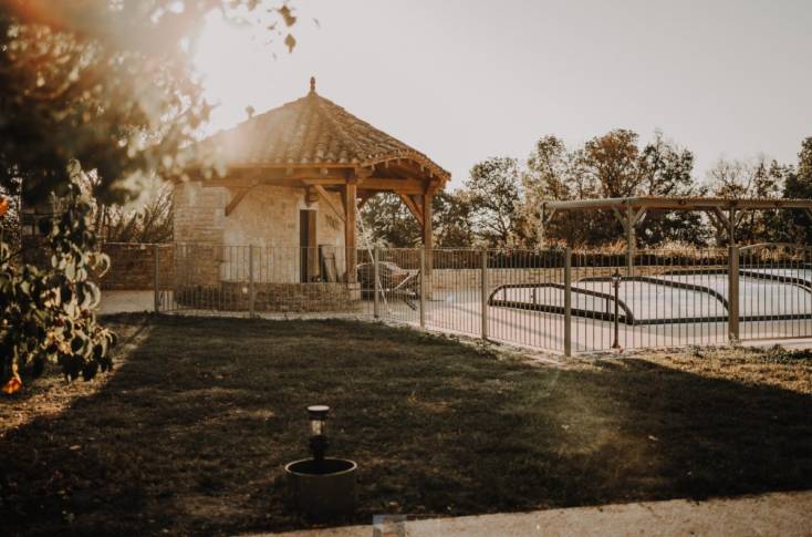Joli terrain entourant les gîtes. Stationnement devant le gîte et borne de recharge électrique. Abri vélo sécurisé.
