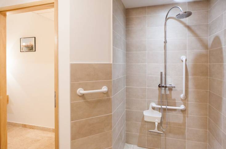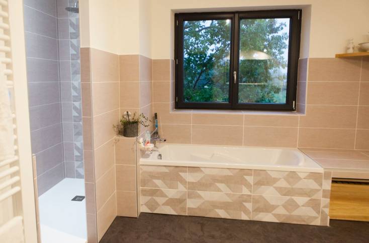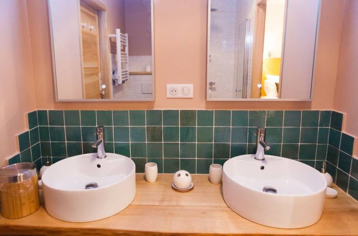 2 chambres avec 1 lit 160 x 200 chacune partagent une salle d'eau commune et wc privatifs. Une chambre en-suite (lit 160 x 200) avec sa salle d'eau et wc privatifs. Une chambre plutôt axée enfants (1 lit 120 et 2 lits superposés en 0,90) et 1 chambre modulaire (2 lits 0,80 x 200 ou bien un lit 160x200) partagent une grande salle de bain (baignoire et douche) et wc indépendants. Salon à l'étage.