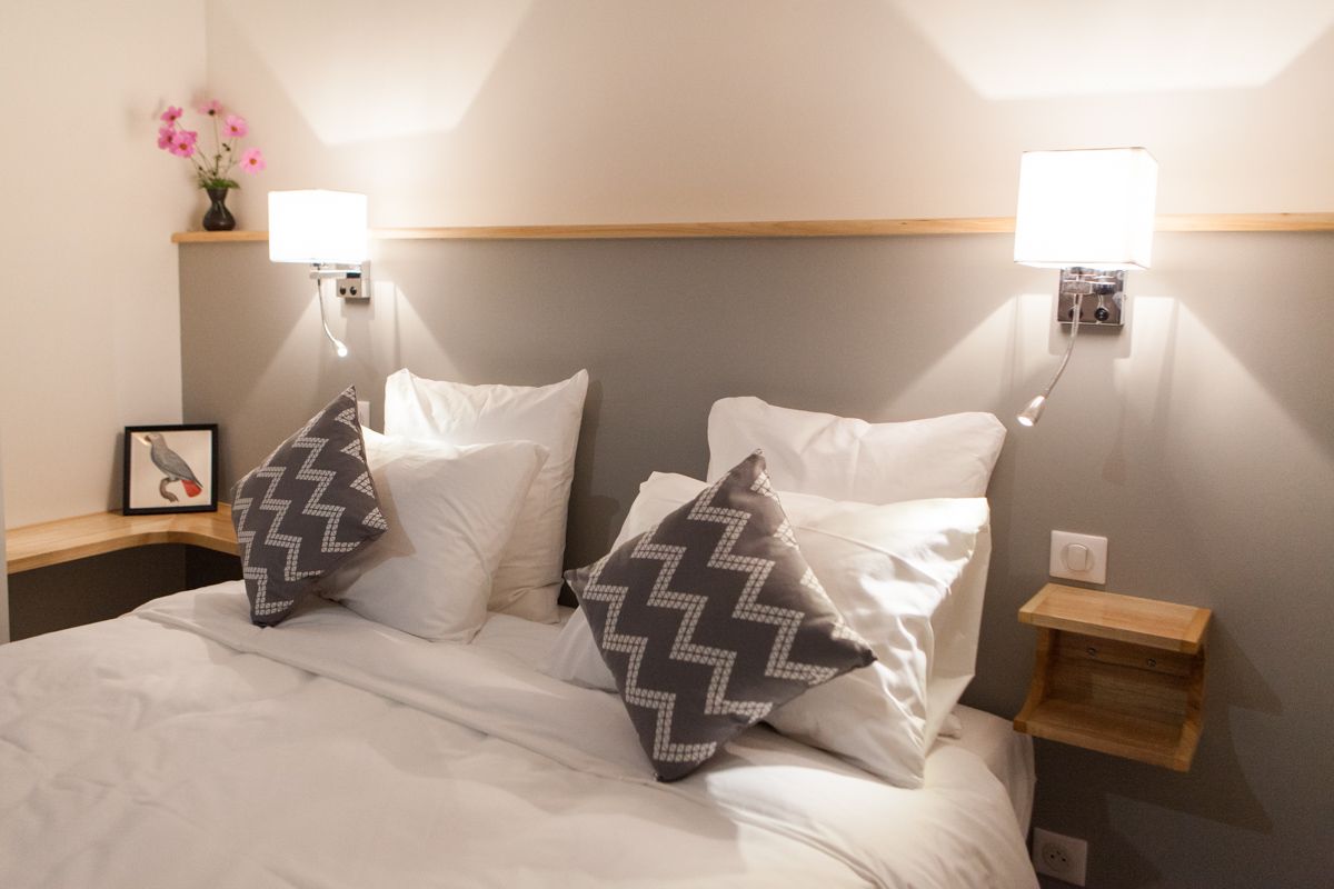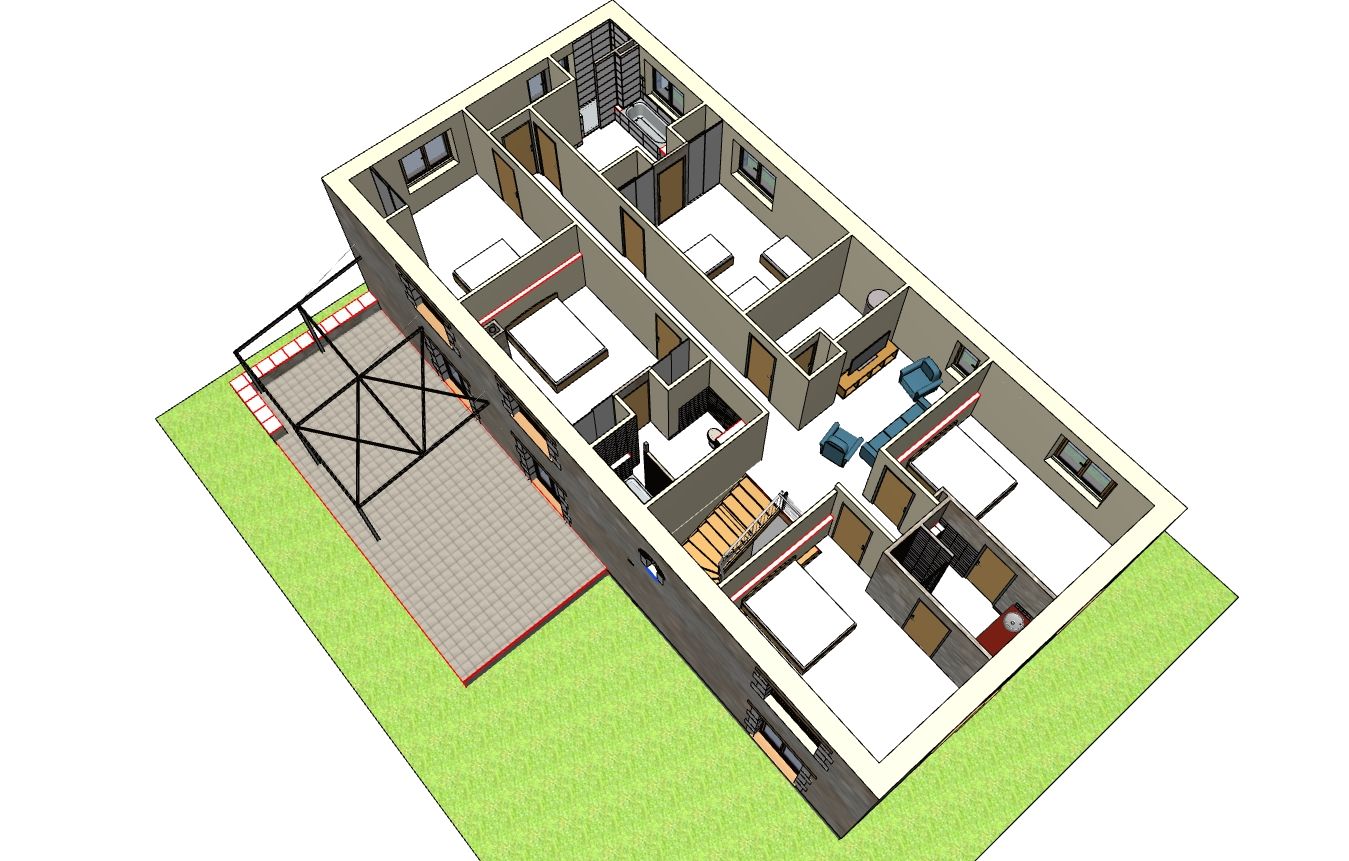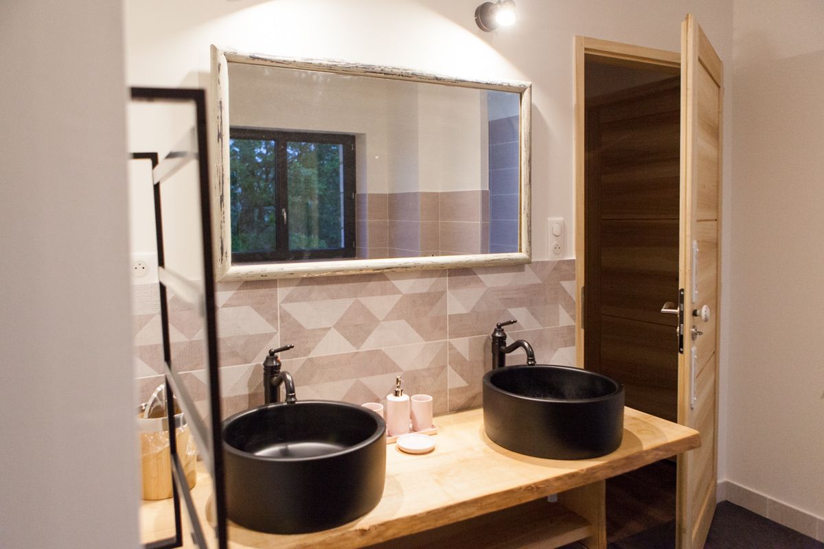2 chambres avec 1 lit 160 x 200 chacune partagent une salle d'eau commune et wc privatifs. Une chambre en-suite (lit 160 x 200) avec sa salle d'eau et wc privatifs. Une chambre plutôt axée enfants (1 lit 120 et 2 lits superposés en 0,90) et 1 chambre modulaire (2 lits 0,80 x 200 ou bien un lit 160x200) partagent une grande salle de bain (baignoire et douche) et wc indépendants. Salon à l'étage.