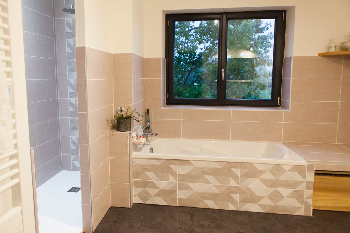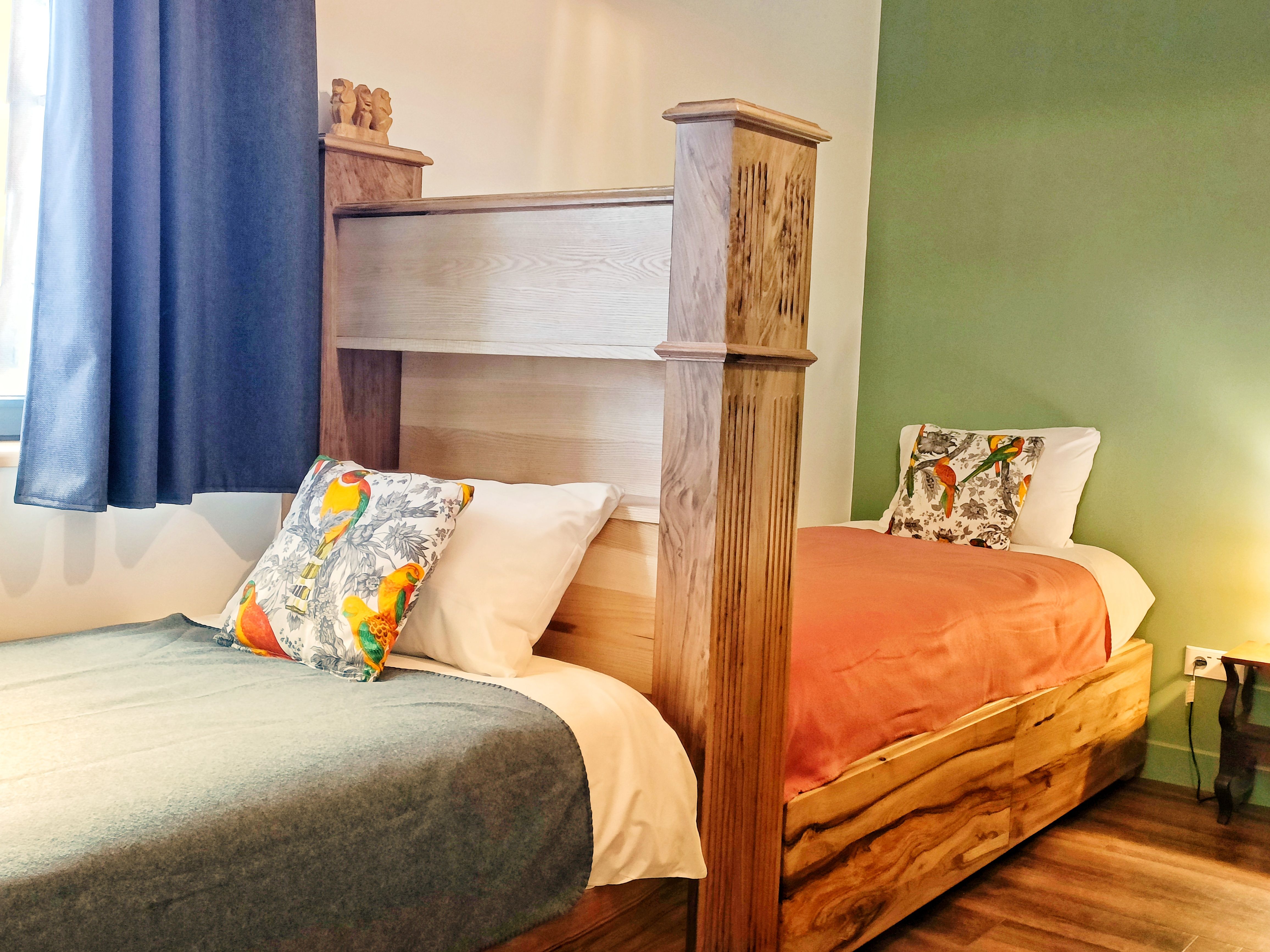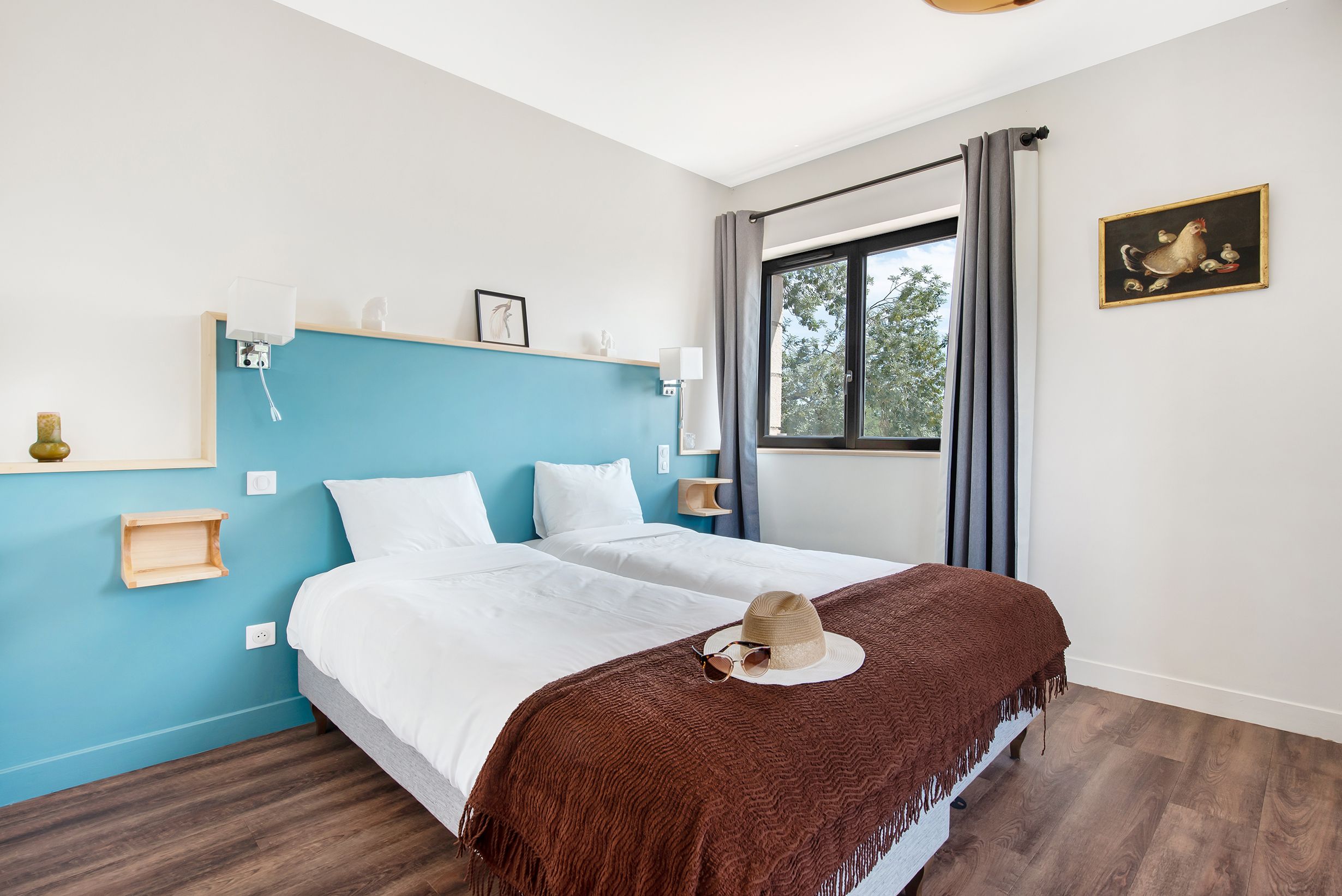 2 chambres avec 1 lit 160 x 200 chacune partagent une salle d'eau commune et wc privatifs. Une chambre en-suite (lit 160 x 200) avec sa salle d'eau et wc privatifs. Une chambre plutôt axée enfants (1 lit 120 et 2 lits superposés en 0,90) et 1 chambre modulaire (2 lits 0,80 x 200 ou bien un lit 160x200) partagent une grande salle de bain (baignoire et douche) et wc indépendants. Salon à l'étage.