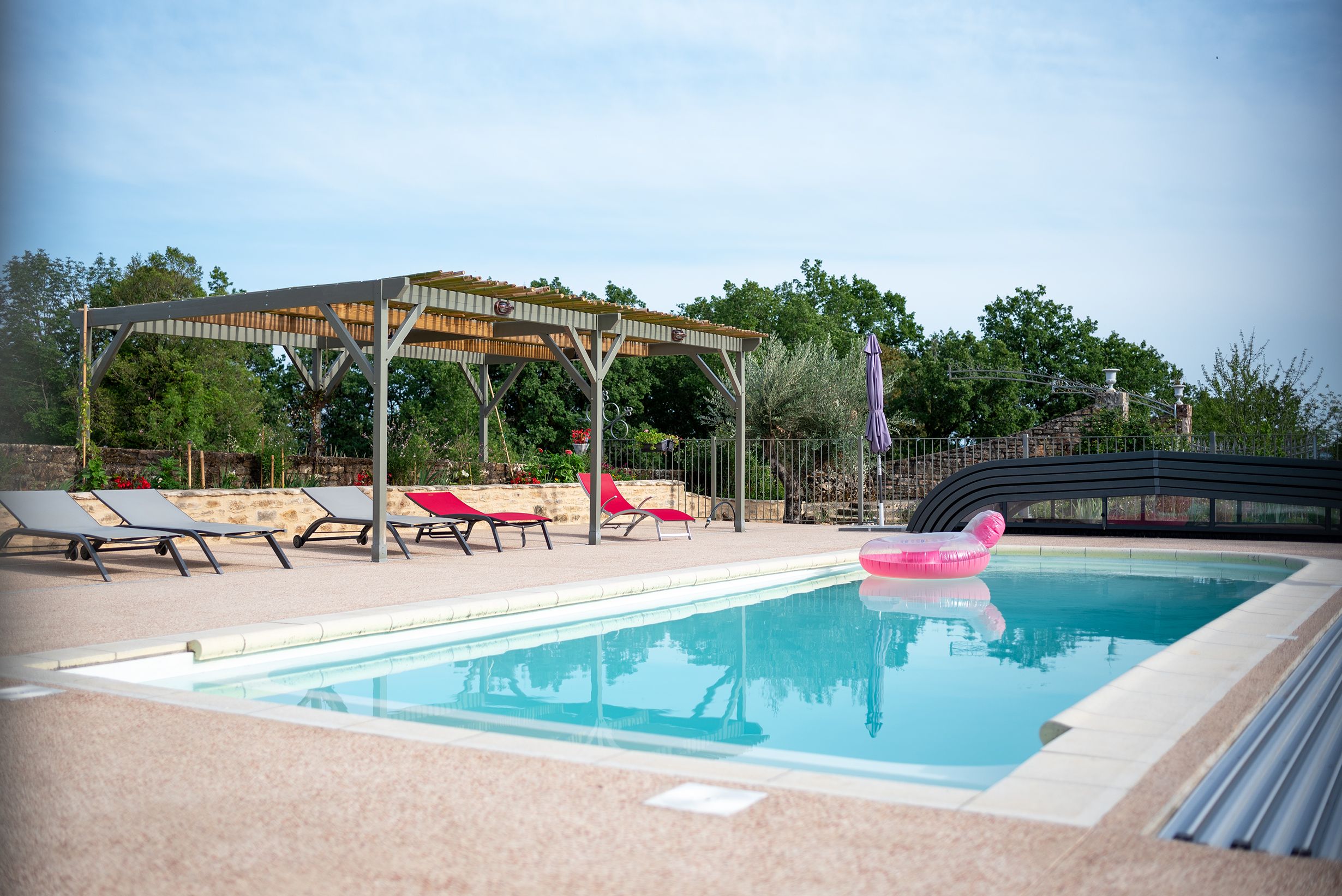 Piscine clôturée (portillon sécurisé) et couverte de 10 x 4m avec escalier et espace pataugeoire. Une pergola le long de la plage vous procurera de l'ombre.