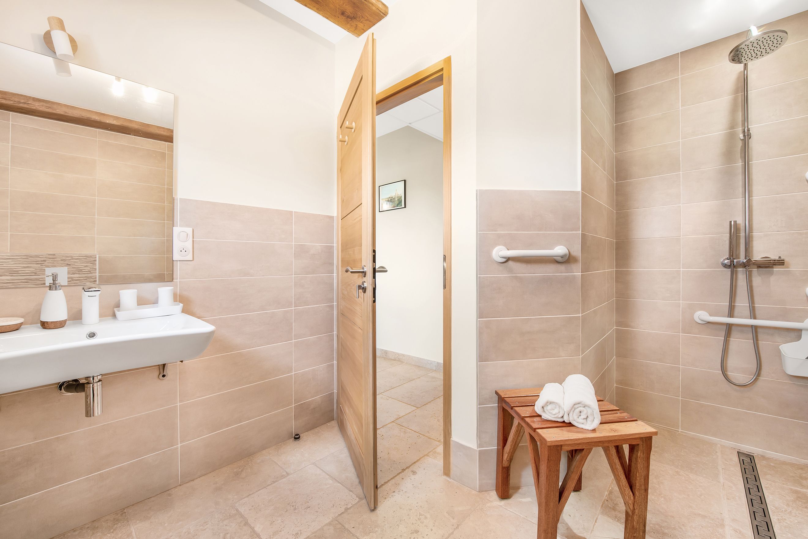 Au rez-de-chaussée, un hall d'entrée donne accès à une grande pièce à vivre de 65 m² regroupant un salon (2 canapés 3 places de part et d'autre d'un poêle bois, 4 fauteuils, table basse, TV, lecteur DVD, Satellite), une cuisine toute équipée (éléments intégrés LV, MO, 2 réfrigérateurs, 1 congélateur, 2 fours) ainsi qu'une salle à manger avec grande table. Accès à la laverie (sèche-linge et lave-linge), grand placard à l'entrée. 1 wc avec lave main et sèche serviette au rez-de-chaussée. Deux chambres accessibles aux personnes à mobilité réduite (1 lit 140 chacune avec salle d'eau et wc privatifs adaptés). Rangement sous escalier.