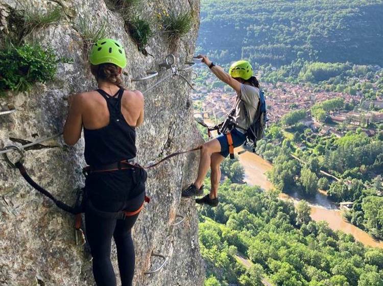 Location de matériel pour la via ferrata du Roc d'Anglars. Composition du kit de via ferrata : baudrier, longe avec absorbeur d'énergie et mousqueton de repos, connecteur Aérolink (Techfun) pour ligne de vie continue, poulie Track (Petzl), casque.